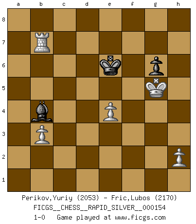 Last move : 1-0 2015 May 6 8:11:51 [Event "FICGS__CHESS__RAPID_SILVER__000154"] [Site "FICGS"] [Date "2014.12.13"] [Round "1"] [White "Perikov,Yuriy"] [Black "Fric,Lubos"] [Result "1-0"] [WhiteElo "2053"] [BlackElo "2170"] 1.d4 d5 2.c4 c6 3.Nf3 Nf6 4.e3 e6 5.Bd3 dxc4 6.Bxc4 Nbd7 7.O-O Bd6 8.Nbd2 O-O 9.b3 c5 10.Bb2 b6 11.Qe2 Bb7 12.e4 Be7 13.Rad1 cxd4 14.Nxd4 Qc7 15.f4 a6 16.Rc1 Qb8 17.Bd3 b5 18.Kh1 g6 19.f5 e5 20.Nc6 Bxc6 21.Rxc6 Qb7 22.R6c1 Rac8 23.Rcd1 Bb4 24.Nf3 Bc3 25.fxg6 hxg6 26.Ba3 Rfe8 27.Ng5 Kg7 28.Rf3 Bd4 29.Rdf1 Rc6 30.Bb4 Rec8 31.Bd2 Nc5 32.Bb1 a5 33.g4 Qa6 34.b4 axb4 35.Nxf7 Kxf7 36.g5 Ncd7 37.Qg2 Rh8 38.gxf6 Rh5 39.Bxb4 Rxf6 40.Bc2 Qc6 41.Bd1 Rh4 42.Bb3+ Kg7 43.Bd5 Qc8 44.Bd2 R6f4 45.Bxf4 Rxf4 46.Rxf4 exf4 47.Be6 Qc6 48.Bxd7 Qxd7 49.Qd2 Qa7 50.Rd1 Be5 51.Qd7+ Qxd7 52.Rxd7+ Kf6 53.Kg2 b4 54.Kf3 b3 55.axb3 Ke6 56.Rd5 Bc3 57.Kxf4 Bb4 58.Kg5 Kf7 59.Rd7+ Ke6 60.Rb7 1-0 QGD Slav : 4.e3 Kingside Castling by player White (move 7) Kingside Castling by player Black (move 8) 10 pieces endgame at move 52 : White KRPPP , Black KBPPP WHITE : King + 1 Rook 3 Pawns BLACK : King + 1 Bishop 3 Pawns 9 pieces endgame at move 55 : White KRPPP , Black KBPP WHITE : King + 1 Rook 3 Pawns BLACK : King + 1 Bishop 2 Pawns 8 pieces endgame at move 57 : White KRPPP , Black KBP WHITE : King + 1 Rook 3 Pawns BLACK : King + 1 Bishop 1 Pawn Player White won this chess game. Follow this game move after move (download)I don't believe in psychology. I believe in good moves. (Bobby Fischer) Woher wissen wir, daß der Neanderthaler Blindschach gespielt hat? -- Bei Ausgrabungen wurden keine Schachbretter und Figuren gefunden. (Anonymous) El poder defensivo de una pieza clavada, solamente es imaginario. (Aaron Nimzovich) Les Echecs, c'est l'art de la guerre sans les charniers, c'est la résurrection des morts tombés au champ d'honneur, l'espoir perpétuel, la suprématie de l'intelligence sur la force, la culture de l'esprit. (F. Szpiner) It is the aim of the modern school, not to treat every position according to one general law, but according to the principle inherent in the position. (Richard Reti)