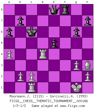 Last move : 1/2-1/2 2015 June 18 7:55:3 [Event "FICGS__CHESS__THEMATIC_TOURNAMENT__000186"] [Site "FICGS"] [Date "2014.12.19"] [Round "1"] [White "Moormann,Joerg"] [Black "Sorcinelli,Andrea"] [Result "1/2-1/2"] [WhiteElo "2115"] [BlackElo "1993"] 1.e4 c5 2.f4 d5 3.Nf3 dxe4 4.Ng5 Nf6 5.Bc4 Bg4 6.Bxf7+ Kd7 7.Qxg4+ Nxg4 8.Be6+ Kc6 9.Bxg4 Qe8 10.Nc3 Nd7 11.O-O Nf6 12.Be6 g6 13.a4 Bh6 14.Re1 Rd8 15.Bc4 a6 16.Ne6 Rd6 17.Nxe4 Rxe6 18.Bxe6 Bxf4 19.g3 Nxe4 20.Rxe4 Bg5 21.Bh3 Rf8 22.d4 Bxc1 23.Rxc1 cxd4 24.Rxd4 e5 1/2-1/2 Sicilian : Grand Prix attack Kingside Castling by player White (move 11) This chess game ended in a draw. Follow this game move after move (download)Could we look into the head of a Chess player, we should see there a whole world of feelings, images, ideas, emotion and passion. (Alfred Binet) Schach ist die gewalttätigste aller Sportarten. (Garry Kasparov) EL Ajedrez es como la vida. (Boris Spassky) Un millionnaire : 'Monsieur Steinitz ! Vous ne participez aux tournois que pour l'argent, alors que moi je n'y viens que pour l'honneur.' Steinitz : 'Chacun joue pour ce qu'il n'a pas'... Luck is what you have left over after you give 100 percent. (Langston Coleman)