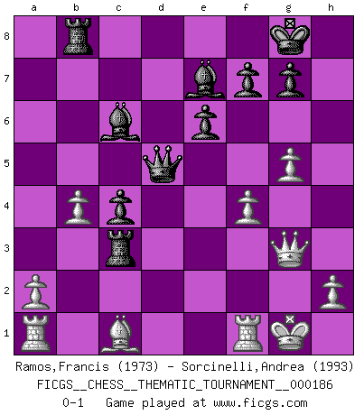Last move : 0-1 2015 February 15 13:19:35 [Event "FICGS__CHESS__THEMATIC_TOURNAMENT__000186"] [Site "FICGS"] [Date "2014.12.19"] [Round "1"] [White "Ramos,Francis"] [Black "Sorcinelli,Andrea"] [Result "0-1"] [WhiteElo "1973"] [BlackElo "1993"] 1.e4 c5 2.f4 d5 3.Nf3 dxe4 4.Ne5 a6 5.Nc3 Nf6 6.Bc4 e6 7.Qe2 b5 8.Nxb5 axb5 9.Bxb5+ Bd7 10.Bc4 Nc6 11.d3 exd3 12.Bxd3 Nd4 13.Qd1 Be7 14.c3 Ba4 15.Qd2 Nf5 16.O-O O-O 17.Qe2 Qc7 18.g4 Nh4 19.g5 Nd7 20.Nxd7 Qxd7 21.Bxh7+ Kxh7 22.Qh5+ Kg8 23.Qxh4 Bc6 24.Qg3 Qd5 25.Be3 Rfb8 26.b3 c4 27.b4 Ra3 28.Bc1 Rxc3 0-1 Sicilian : Grand Prix attack Kingside Castling by player White (move 16) Kingside Castling by player Black (move 16) Player Black won this chess game. Follow this game move after move (download)When I asked Fischer why he had not played a certain move in our game, he replied: 'Well, you laughed when I wrote it down !' (Mikhail Tal) Im Leben werden Partien nie so unstrittig gewonnen wie im Spiel (Emanuel Lasker) Por la belleza de sus partidas, la claridad de su juego y lo brillante de sus ideas, Fischer se creó el mismo como un artista de la misma estatura como Brahms, Rembrandt y Shakespeare. (David Levy) Aucun coup ne doit être joué sans but. (Pedro Damiano) Unless in communicating with it one says exactly what one means, trouble is bound to result. (Alan Turing, about computers)