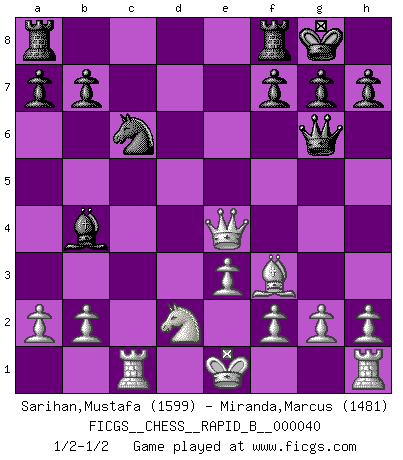 Last move : 1/2-1/2 2007 March 19 11:38:0 [Event "FICGS__CHESS__RAPID_B__000040"] [Site "FICGS"] [Date "2007.02.27"] [Round "1"] [White "Sarihan,Mustafa"] [Black "Miranda,Marcus"] [Result "1/2-1/2"] [WhiteElo "1599"] [BlackElo "1481"] 1.c4 e6 2.d4 d5 3.Nf3 c5 4.cxd5 exd5 5.Nc3 Nc6 6.dxc5 Nf6 7.Bg5 Be7 8.e3 O-O 9.Qb3 Bxc5 10.Bxf6 Qxf6 11.Nxd5 Qg6 12.Rc1 Bd6 13.Nd2 Be6 14.Bd3 Qg4 15.Be4 Bb4 16.Bf3 Bxd5 17.Qxd5 Qg6 18.Qe4 1/2-1/2 English Opening Kingside Castling by player Black (move 8) This chess game ended in a draw. Follow this game move after move (download)We don't really know how the game was invented, though there are suspicions. As soon as we discover the culprits, we'll let you know. (Bruce Pandolfini) Ich brauche nur einen Blick auf das Schachbrett zu werfen, und weiß schon, was in der Stellung steckt, was geschehen kann und was geschehen wird. Alle übrigen suchen und prüfen, ich aber weiß es! (José Raúl Capablanca) En manos de Fischer's, una diminuta ventaja teórica es tan buena como tener una Reina de ventaja. (Isaac Kashdan) Il vaut toujours mieux jouer un plan faux de façon logique que de n'avoir pas de plan du tout. (Victor Kortchnoï) The absolute truth is the thing that makes people laugh. (Carl Reiner)
