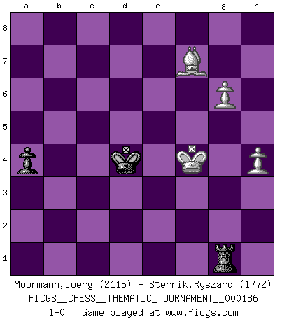 Last move : 1-0 2015 July 23 13:33:46 [Event "FICGS__CHESS__THEMATIC_TOURNAMENT__000186"] [Site "FICGS"] [Date "2014.12.19"] [Round "1"] [White "Moormann,Joerg"] [Black "Sternik,Ryszard"] [Result "1-0"] [WhiteElo "2115"] [BlackElo "1772"] 1.e4 c5 2.f4 d5 3.Nf3 dxe4 4.Ng5 Nf6 5.Bc4 Bg4 6.Bxf7+ Kd7 7.Qxg4+ Nxg4 8.Be6+ Kc6 9.Bxg4 g6 10.Ne6 Qe8 11.Nc3 h5 12.Bh3 Na6 13.Nxe4 Nb4 14.O-O Nxc2 15.b4 Nxa1 16.Bb2 Rg8 17.Rc1 b6 18.bxc5 Rc8 19.cxb6 Kxb6 20.Bd4+ Ka5 21.N4c5 Qb5 22.Bc3+ Kb6 23.a4 Qxc5+ 24.Nxc5 Rxc5 25.Be6 Rxc3 26.dxc3 Rh8 27.Rxa1 Bg7 28.Rb1+ Kc5 29.g3 Bxc3 30.Bf7 e5 31.Rc1 Kb4 32.fxe5 Bxe5 33.Rc4+ Ka3 34.Bxg6 Rh6 35.Be8 Rh8 36.Bb5 Rd8 37.Re4 Bf6 38.Kg2 Rd2+ 39.Be2 Bc3 40.Kh3 Rd5 41.Rh4 Rd2 42.Bxh5 Bd4 43.Re4 Kxa4 44.g4 Kb5 45.g5 Kc5 46.Bf7 a5 47.Kg3 a4 48.g6 Rd1 49.Rxd4 Kxd4 50.Kf4 Rg1 51.h4 1-0 Sicilian : Grand Prix attack Kingside Castling by player White (move 14) 10 pieces endgame at move 42 : White KRBPPP , Black KRBP WHITE : King + 1 Rook 1 Bishop 3 Pawns BLACK : King + 1 Rook 1 Bishop 1 Pawn 9 pieces endgame at move 43 : White KRBPP , Black KRBP WHITE : King + 1 Rook 1 Bishop 2 Pawns BLACK : King + 1 Rook 1 Bishop 1 Pawn 8 pieces endgame at move 49 : White KRBPP , Black KRP WHITE : King + 1 Rook 1 Bishop 2 Pawns BLACK : King + 1 Rook 1 Pawn 7 pieces endgame at move 49 : White KBPP , Black KRP WHITE : King + 1 Bishop 2 Pawns BLACK : King + 1 Rook 1 Pawn Player White won this chess game. Follow this game move after move (download)Alekhine is a poet who creates a work of art out of something that would hardly inspire another man to send home a picture post card. (Max Euwe) Ich habe kein Problem mit Frauen, sondern nur mit dem Niveau ihres Schachspiels (Judith Polgar) Creo que una cierta cantidad de temperamento es esperada de los genios del Ajedrez. (Ron Gross) Seul un grand joueur sait à quel point il joue faiblement. (Xavier Tartacover) Two beer, or not two beer. (Unknown)