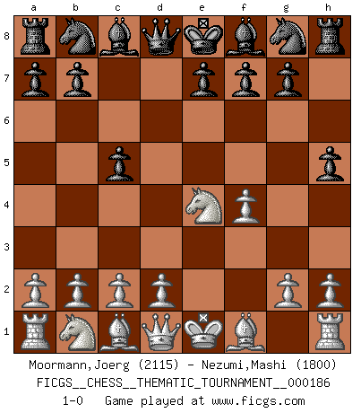 Last move : 1-0 2015 March 19 14:6:37 [Event "FICGS__CHESS__THEMATIC_TOURNAMENT__000186"] [Site "FICGS"] [Date "2014.12.19"] [Round "1"] [White "Moormann,Joerg"] [Black "Nezumi,Mashi"] [Result "1-0"] [WhiteElo "2115"] [BlackElo "1800"] 1.e4 c5 2.f4 d5 3.Nf3 dxe4 4.Ng5 h5 5.Nxe4 1-0 This chess game has been lost on time (started : 2014.12.19 2:21:21) Sicilian : Grand Prix attack Player White won this chess game. Follow this game move after move (download)The game of Chess is not merely an idle amusement; several very valuable qualities of the mind are to be acquired and strengthened by it, so as to become habits ready on all occasions; for life is a kind of Chess. (Benjamin Franklin) Kasparov ist eine Art Monster mit hundert Augen, denen auch nicht das Geringste entgeht. (Tony Miles) Cuando la partida de Ajedrez termina, el Peón y el Rey regresan a la misma caja. (Irish saying) Le système Elo représente seulement une moyenne. Il est simplement un indicateur de votre stabilité. (Anatoli Karpov) The general who wins the battle makes many calculations in his temple before the battle is fought. The general who loses makes but few calculations beforehand. (Sun Tzu)