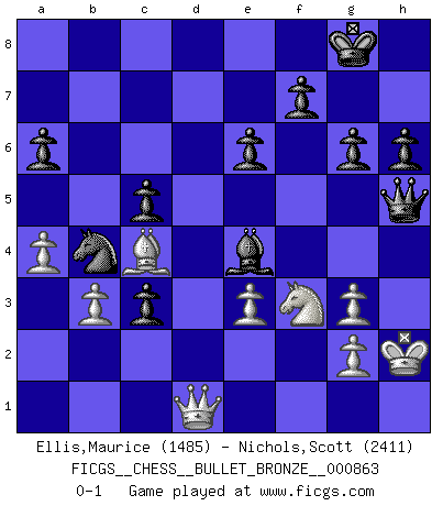 Last move : 0-1 2014 December 21 20:43:12 [Event "FICGS__CHESS__BULLET_BRONZE__000863"] [Site "FICGS"] [Date "2014.12.21"] [Round "1"] [White "Ellis,Maurice"] [Black "Nichols,Scott"] [Result "0-1"] [WhiteElo "1485"] [BlackElo "2411"] 1.e4 c5 2.c3 g6 3.d4 Qc7 4.Nf3 Bg7 5.Be2 d6 6.dxc5 dxc5 7.O-O Nf6 8.Qc2 O-O 9.Bg5 Nc6 10.Nbd2 h6 11.Bh4 Nh5 12.b3 Rd8 13.Bg3 Nxg3 14.hxg3 a6 15.Rfd1 b5 16.Nf1 Bb7 17.Ne3 e6 18.Rxd8+ Rxd8 19.a4 b4 20.Bc4 bxc3 21.Rd1 Nb4 22.Qe2 Rxd1+ 23.Qxd1 Bxe4 24.Ne1 Bd4 25.Kh2 Bxe3 26.fxe3 Qe5 27.Nf3 Qh5+ 0-1 Sicilian : Alapin's variation (2.c3) Kingside Castling by player White (move 7) Kingside Castling by player Black (move 8) Player Black won this chess game. Follow this game move after move (download)All I want to do, ever, is just play Chess. (Bobby Fischer) Um sich vor der Gefahr einer Erkältung zu schützen, sorge der wanderlustige König beizeiten für ein brauchbares Versteck. (Aaron Nimzowitsch) ¿Cual es el objetivo de jugar una apertura de gambito?... Para adquirir una reputación de ser un jugador apuesto a costo de perder el juego. (Siegbert Tarrasch) Aucun coup ne doit être joué sans but. (Pedro Damiano) Quotation,n.: The act of repeating erroneously the words of another. The words erroneously repeated. (Ambrose Bierce, The Devil's Dictionary)
