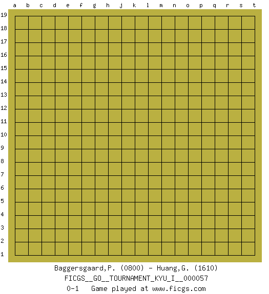Last move : 0-1 2015 January 22 17:42:29 [Event "FICGS__GO__TOURNAMENT_KYU_I__000057"] [Site "FICGS"] [Date "2014.12.23"] [Round "1"] [Black "Baggersgaard,Poulerik"] [White "Huang,Gary"] [Result "0-1"] [Rating 1 "0800"] [Rating 2 "1610"] 0-1 This go game has been lost on time (started : 2014.12.23 10:45:54) Here are the names of the openings (joseki) played in the four corners : Player White won this Go (weiqi, baduk) game. Follow this game move after move (download)There is damezumari at the bamboo joint. (Anonymous) All war is based on deception. (Sun Tzu)