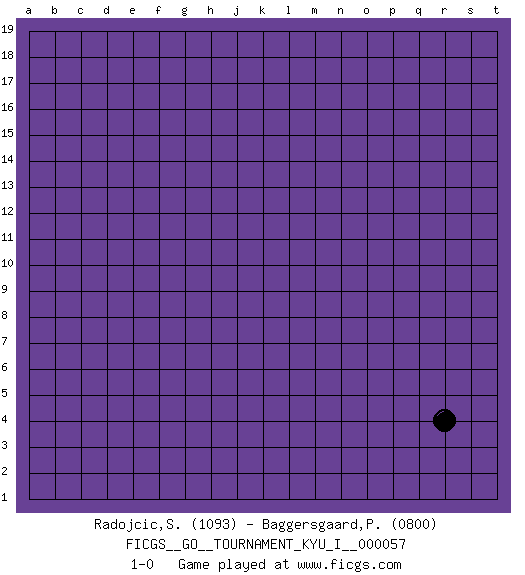 Last move : 1-0 2015 January 23 17:46:6 [Event "FICGS__GO__TOURNAMENT_KYU_I__000057"] [Site "FICGS"] [Date "2014.12.23"] [Round "1"] [Black "Radojcic,Sasa"] [White "Baggersgaard,Poulerik"] [Result "1-0"] [Rating 1 "1093"] [Rating 2 "0800"] 1.r4 1-0 This go game has been lost on time (started : 2014.12.23 10:45:54) Here are the names of the openings (joseki) played in the four corners : Corner q4 : r4 1-0 Komoku (Somok, Xiao~mu`) 3-4 Point. The komoku (3-4) point is the traditional corner enclosure move.. Player Black won this Go (weiqi, baduk) game. Follow this game move after move (download)On the third line, four die, six live. (Anonymous) Life is like a game of cards: the hand you are dealt represents determinism; the way you play it is free will. (Jawaharlal Nehru)