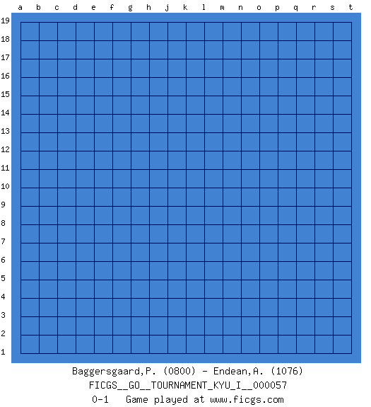 Last move : 0-1 2015 January 22 17:42:29 [Event "FICGS__GO__TOURNAMENT_KYU_I__000057"] [Site "FICGS"] [Date "2014.12.23"] [Round "1"] [Black "Baggersgaard,Poulerik"] [White "Endean,Andrew"] [Result "0-1"] [Rating 1 "0800"] [Rating 2 "1076"] 0-1 This go game has been lost on time (started : 2014.12.23 10:45:54) Here are the names of the openings (joseki) played in the four corners : Player White won this Go (weiqi, baduk) game. Follow this game move after move (download)Always remember, keep the balance. [between territory and influence] (Figaro) When you have everything, sometimes it feels like nothing. (Horatio Caine, C.S.I. Miami)