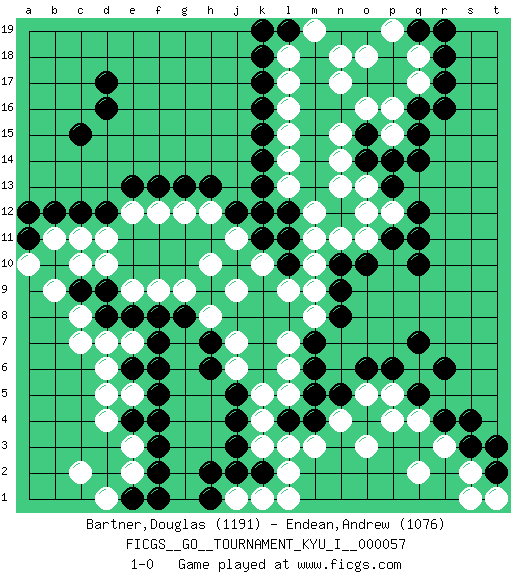 Last move : 1-0 2015 March 19 20:22:11 [Event "FICGS__GO__TOURNAMENT_KYU_I__000057"] [Site "FICGS"] [Date "2014.12.23"] [Round "1"] [Black "Bartner,Douglas"] [White "Endean,Andrew"] [Result "1-0"] [Rating 1 "1191"] [Rating 2 "1076"] 1.r16 d4 2.d17 q4 3.c15 p16 4.q14 n17 5.k16 q17 6.r17 q18 7.r18 l17 8.k17 l16 9.k15 l15 10.r6 o3 11.s4 r3 12.q10 d10 13.d12 c7 14.f3 e3 15.f4 k4 16.f6 d6 17.k13 l13 18.k14 l14 19.j5 k5 20.j4 j6 21.h6 j7 22.j3 k3 23.p6 o5 24.o6 p5 25.k2 l2 26.h2 e12 27.e13 f12 28.f13 d11 29.c12 c11 30.q11 o11 31.o10 n11 32.n10 m10 33.n8 m9 34.n9 m8 35.m6 l6 36.b12 b11 37.a11 a10 38.a12 b9 39.p13 o13 40.o14 n13 41.g13 g12 42.n5 n4 43.m4 m3 44.k18 l18 45.l19 m19 46.k19 n18 47.s3 s2 48.r4 q2 49.q5 p4 50.g8 f9 51.f8 g9 52.m7 l7 53.f2 e2 54.e1 d1 55.f1 c2 56.h13 h12 57.p11 p12 58.q12 o12 59.d8 c8 60.d9 e9 61.e8 h8 62.h7 j9 63.j12 j11 64.k11 k10 65.q19 p19 66.r19 o18 67.q16 p15 68.p14 n14 69.o15 o16 70.q15 n15 71.e4 d5 72.l11 h10 73.l10 l9 74.e6 d7 75.c9 c10 76.l4 l3 77.m5 l5 78.l12 m12 79.t2 s1 80.d16 m11 81.k12 k1 82.j2 j1 83.h1 l1 84.q7 e7 85.f7 t1 86.t3 e5 87.f5 pass 88.pass 1-0 Here are the names of the openings (joseki) played in the four corners : Corner q16 : r16 p16 Komoku (Somok, Xiao~mu`) 3-4 Point. The komoku (3-4) point is the traditional corner enclosure move.. Ikken Takagakari (Hankan Nop'dakeolch'im, Yi Gaogua`jiao~, 1-Space High Approach). The 5-4 approach move has become more popular in modern times, as modern Go emphasizes speed and influence. Corner q4 : q4 r6 Hoshi (Hwajeom, Seongjeom, Xingwei`) 4-4 Point. The star or hoshi (4-4) point, emphasizing influence at the potential expense of territory. Ikken Kakari (Hankan Keolch'im, Yi Gua`jiao~, 1-Space Low Approach). Black 2 is the standard approach move to the 4-4. Player Black won this Go (weiqi, baduk) game. Follow this game move after move (download)Learn the eye-stealing tesuji. (Anonymous) If only people were all showed a certain minimum level of niceness; if only people didn't retract verbal draw offers (without draw box ticked) on ficgs; if only people didn't kill; if only people didn't run concentration / extermination camps, if only people didn't drop nuclear bombs on Hiroshima and Nagasaki, and so on - it would be a much more beautiful world. But sadly, things are not so... (Normajean Yates)