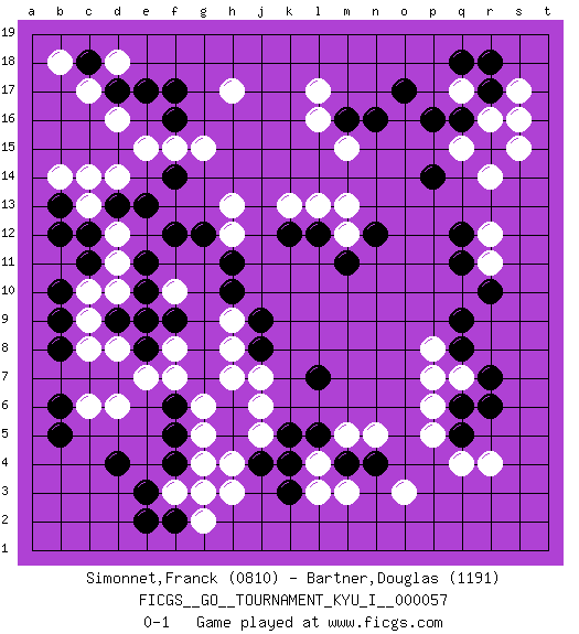 Last move : 0-1 2015 January 22 20:1:52 [Event "FICGS__GO__TOURNAMENT_KYU_I__000057"] [Site "FICGS"] [Date "2014.12.23"] [Round "1"] [Black "Simonnet,Franck"] [White "Bartner,Douglas"] [Result "0-1"] [Rating 1 "0810"] [Rating 2 "1191"] 1.q16 d16 2.d4 q4 3.r6 o3 4.f17 h17 5.f16 d14 6.f14 l17 7.o17 r14 8.e10 d11 9.d9 s16 10.r15 s15 11.k3 h4 12.g3 g4 13.k5 h3 14.c11 d12 15.c12 c13 16.b13 b14 17.b12 e15 18.r10 d6 19.f5 c10 20.b10 c9 21.b9 c8 22.b8 c6 23.d17 c17 24.b5 d10 25.b6 f3 26.e3 f15 27.e13 g15 28.d13 c14 29.f12 e9 30.e8 d8 31.f9 f10 32.e11 f8 33.d9 e7 34.e9 f7 35.h6 h8 36.j9 h7 37.j8 j7 38.l7 j6 39.h5 j5 40.j4 g5 41.f6 g6 42.f2 g2 43.f4 g3 44.e2 h9 45.h10 q17 46.r17 r16 47.q18 q15 48.p16 s17 49.r18 r4 50.p14 r12 51.q12 r11 52.q11 p6 53.q5 p5 54.q6 p7 55.q8 q7 56.r7 p8 57.q9 l4 58.k4 m15 59.c18 d18 60.e17 b18 61.m16 l16 62.n16 l3 63.l5 h13 64.g12 h12 65.h11 m13 66.k12 k13 67.l12 l13 68.n12 m12 69.m11 n5 70.m4 m3 71.n4 m5 0-1 Here are the names of the openings (joseki) played in the four corners : Corner q4 : q4 r6 Hoshi (Hwajeom, Seongjeom, Xingwei`) 4-4 Point. The star or hoshi (4-4) point, emphasizing influence at the potential expense of territory. Ikken Kakari (Hankan Keolch'im, Yi Gua`jiao~, 1-Space Low Approach). Black 2 is the standard approach move to the 4-4. Corner d16 : d16 f17 Hoshi (Hwajeom, Seongjeom, Xingwei`) 4-4 Point. The star or hoshi (4-4) point, emphasizing influence at the potential expense of territory. Ikken Kakari (Hankan Keolch'im, Yi Gua`jiao~, 1-Space Low Approach). Black 2 is the standard approach move to the 4-4. Corner q16 : q16 l17 Hoshi (Hwajeom, Seongjeom, Xingwei`) 4-4 Point. The star or hoshi (4-4) point, emphasizing influence at the potential expense of territory. Player White won this Go (weiqi, baduk) game. Follow this game move after move (download)Don't make dango's. (Anonymous) You cannot beat a roulette table unless you steal money from it. (Albert Einstein)