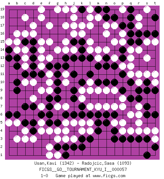 Last move : 1-0 2015 June 22 19:28:7 [Event "FICGS__GO__TOURNAMENT_KYU_I__000057"] [Site "FICGS"] [Date "2014.12.23"] [Round "1"] [Black "Usan,Kavi"] [White "Radojcic,Sasa"] [Result "1-0"] [Rating 1 "1342"] [Rating 2 "1093"] 1.q16 d3 2.q3 c16 3.r9 r5 4.q5 r4 5.r3 q4 6.p3 p4 7.o3 q6 8.e16 p5 9.d5 c4 10.c5 b5 11.b6 a5 12.a6 b3 13.c7 d17 14.e17 e18 15.f18 e19 16.f19 c18 17.g17 k16 18.m16 l17 19.m17 m18 20.n18 l18 21.l16 j17 22.c11 c13 23.e11 d10 24.d11 d8 25.b9 c10 26.b10 e9 27.g11 r11 28.p9 r14 29.r15 q14 30.k3 h4 31.g5 g4 32.f5 f4 33.g9 g7 34.f8 f9 35.g8 e7 36.f7 e5 37.e6 e4 38.d7 h11 39.h12 f10 40.g10 f11 41.f12 e12 42.d13 e13 43.d12 e14 44.d14 e15 45.d15 d16 46.f16 g14 47.j15 h15 48.g15 j14 49.h16 h14 50.k15 j16 51.h18 j18 52.k19 j19 53.k18 h17 54.g16 h19 55.g18 l19 56.n19 n17 57.o18 f15 58.m19 k17 59.k19 l15 60.k14 l14 61.k13 n16 62.m15 m14 63.n15 o15 64.j13 h5 65.f6 h7 66.p11 n14 67.p17 g19 68.j11 h10 69.j9 f17 70.s3 s4 71.s6 r6 72.s7 r7 73.r8 p7 74.o6 o7 75.n6 n7 76.m6 m7 77.l6 l7 78.j6 o9 79.o10 n9 80.n10 m9 81.h6 o17 82.q18 c14 83.c15 b15 84.b13 b14 85.b12 c12 86.a14 b16 87.p14 q12 88.p13 q13 89.q15 s15 90.s16 t15 91.t16 s13 92.h2 f2 93.s10 s11 94.q10 t10 95.t9 t11 96.k7 k8 97.j8 k9 98.k10 l10 99.l11 p12 100.o12 p15 101.n13 o13 102.n12 k4 103.l3 l4 104.m4 j3 105.j2 h3 106.o4 o5 107.n5 k5 108.k6 j5 109.g2 g1 110.h1 f1 111.m10 l9 112.l13 g3 113.k2 p8 114.q8 t3 115.t2 t4 116.s1 r10 117.s9 a15 118.a13 f13 119.g12 m13 120.m12 p16 121.d4 c3 122.t6 l5 123.m5 q11 124.h13 r17 125.q17 r18 126.r16 p19 127.q19 s19 128.t18 pass 129.pass pass 130.pass 1-0 Here are the names of the openings (joseki) played in the four corners : Corner d16 : c16 e16 Komoku (Somok, Xiao~mu`) 3-4 Point. The komoku (3-4) point is the traditional corner enclosure move.. Ikken Takagakari (Hankan Nop'dakeolch'im, Yi Gaogua`jiao~, 1-Space High Approach). The 5-4 approach move has become more popular in modern times, as modern Go emphasizes speed and influence. Corner d4 : d3 d5 Komoku (Somok, Xiao~mu`) 3-4 Point. The komoku (3-4) point is the traditional corner enclosure move.. Ikken Takagakari (Hankan Nop'dakeolch'im, Yi Gaogua`jiao~, 1-Space High Approach). The 5-4 approach move has become more popular in modern times, as modern Go emphasizes speed and influence. Player Black won this Go (weiqi, baduk) game. Follow this game move after move (download)More haste less speed. (John Fairbairn) I take risks, sometimes patients die, but not taking risks causes more patients to die. So I guess my biggest problem is I've been cursed with the ability to do the math. (Gregory House, House M.D.)