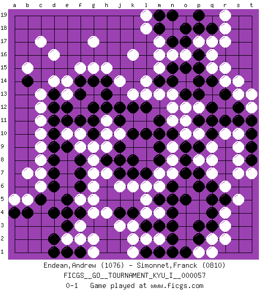 Last move : 0-1 2015 August 20 22:49:38 [Event "FICGS__GO__TOURNAMENT_KYU_I__000057"] [Site "FICGS"] [Date "2014.12.23"] [Round "1"] [Black "Endean,Andrew"] [White "Simonnet,Franck"] [Result "0-1"] [Rating 1 "1076"] [Rating 2 "0810"] 1.q4 q16 2.d4 d16 3.q10 r6 4.q6 q7 5.p6 q8 6.r13 r4 7.q3 r3 8.r5 s5 9.q5 s7 10.p7 p8 11.o8 c6 12.c5 f3 13.e3 f5 14.d6 c7 15.d7 c8 16.d8 c9 17.d9 c10 18.d10 c11 19.d11 c12 20.d12 c13 21.d13 f15 22.f14 r14 23.q14 r15 24.p14 k3 25.n3 k16 26.n15 k13 27.h13 g8 28.f8 f9 29.f7 g7 30.e9 f10 31.f11 h11 32.g12 e10 33.e11 e14 34.g14 e13 35.f13 h15 36.j12 k11 37.j11 j10 38.h12 h10 39.g10 g9 40.g11 e2 41.d2 g2 42.f4 g4 43.e4 b5 44.b4 a5 45.a4 b7 46.f6 g6 47.e5 g5 48.n10 n13 49.o17 n16 50.o15 o16 51.p16 p17 52.p15 r17 53.n17 m16 54.p18 q17 55.q18 r10 56.r11 s10 57.s11 p10 58.q11 q9 59.o9 m6 60.o5 m17 61.m18 l18 62.m19 n18 63.o18 l19 64.n19 r18 65.p19 p12 66.q12 s13 67.s12 s14 68.o13 o12 69.p13 q15 70.p11 o11 71.n14 m13 72.k12 l13 73.k10 l11 74.l12 n12 75.l10 h9 76.m11 o10 77.n6 d14 78.e12 m4 79.n4 m2 80.n2 q2 81.p2 r2 82.p9 n7 83.o7 m7 84.m5 l5 85.n5 g15 86.k8 k6 87.m3 l4 88.l3 l2 89.j7 j6 90.l7 l6 91.m8 n8 92.m9 j14 93.e1 f2 94.f1 g1 95.d1 n9 96.j9 t12 97.t11 t13 98.t10 s9 99.t9 s8 100.t8 t7 101.m1 k2 102.l1 k1 103.n1 p1 104.o1 q1 105.p3 r19 106.h8 h7 107.j8 c17 108.h14 g17 109.k7 n11 110.m10 m15 111.m14 l14 112.b14 b15 113.j4 j3 114.k4 h4 115.pass pass 116.pass pass 0-1 Comment by player 2 : Franck Simonnet : i think white is wining by +70 approx Here are the names of the openings (joseki) played in the four corners : Corner q4 : q4 r6 Hoshi (Hwajeom, Seongjeom, Xingwei`) 4-4 Point. The star or hoshi (4-4) point, emphasizing influence at the potential expense of territory. Ikken Kakari (Hankan Keolch'im, Yi Gua`jiao~, 1-Space Low Approach). White 2 is the standard approach move to the 4-4. Corner q16 : q16 r13 Hoshi (Hwajeom, Seongjeom, Xingwei`) 4-4 Point. The star or hoshi (4-4) point, emphasizing influence at the potential expense of territory. Niken Kakari (Dukan Keolch'im, E`r Gua`jiao~, 2-Space Low Approach). White typically answers by 7-3 or 3-5 (which is not joseki). Corner d4 : d4 c6 Hoshi (Hwajeom, Seongjeom, Xingwei`) 4-4 Point. The star or hoshi (4-4) point, emphasizing influence at the potential expense of territory. Ikken Kakari (Hankan Keolch'im, Yi Gua`jiao~, 1-Space Low Approach). White 2 is the standard approach move to the 4-4. Player White won this Go (weiqi, baduk) game. Follow this game move after move (download)Fighting must not be the key to go, it should be reserved as your last resource. (Zhong-Pu Liu, about Weiqi) Now the reason the enlightened prince and the wise general conquer the enemy whenever they move and their achievements surpass those of ordinary men is foreknowledge. (Sun Tzu)