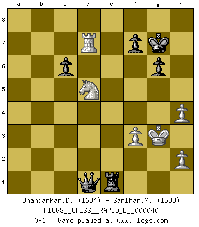 Last move : 0-1 2007 June 26 18:15:38 [Event "FICGS__CHESS__RAPID_B__000040"] [Site "FICGS"] [Date "2007.02.27"] [Round "1"] [White "Bhandarkar,Dinesh"] [Black "Sarihan,Mustafa"] [Result "0-1"] [WhiteElo "1684"] [BlackElo "1599"] 1.e4 e5 2.d4 exd4 3.c3 dxc3 4.Nxc3 Nc6 5.Nf3 Bb4 6.Bc4 Nf6 7.O-O O-O 8.Nd5 Nxe4 9.Qc2 Nf6 10.Ng5 g6 11.Qb3 Ba5 12.Qh3 h5 13.Qf3 Nxd5 14.Bxd5 Qe7 15.Ne4 Nd4 16.Qd3 Ne6 17.Bh6 Rd8 18.Bxe6 dxe6 19.Qg3 Rd5 20.Bg5 Rxg5 21.Nxg5 c6 22.Rad1 e5 23.Ne4 Bg4 24.f3 Bf5 25.a3 h4 26.Qg5 Qxg5 27.Nxg5 Bb6+ 28.Kh1 Bd4 29.b4 Bb2 30.a4 a5 31.bxa5 Rxa5 32.Rd8+ Kg7 33.Rb8 Bd3 34.Rd1 Ba6 35.g3 Rxa4 36.Rd7 Ra1+ 37.Kg2 Bf1+ 38.Kf2 Bd4+ 39.Rxd4 exd4 40.Rxb7 Bc4 41.gxh4 Ra2+ 42.Kg3 d3 43.Ne4 d2 44.Rd7 Bd5 45.Nf2 Ra3 46.Nd1 Ra1 47.Ne3 Re1 48.Nxd5 d1Q 0-1 Danish gambit Kingside Castling by player White (move 7) Kingside Castling by player Black (move 7) Promotion Queen by player Black (move 48) Player Black won this chess game. Follow this game move after move (download)It is no time to be playing Chess when the house is on fire. (Italian Proverb) Karpov ist ein Museumsstück. (Garry Kasparov) Tu cuerpo tiene que estar en óptima condición. Tu Ajedrez se deteriora como lo hace tu cuerpo. No puedes separar la mente y el cuerpo. (Bobby Fischer) Les Echecs ne sont pas pour les âmes timides. Ils requièrent un homme entier, qui ne s'arrête pas aveuglément à ce qui a été déjà établi, mais qui tente individuellement de sonder les profondeurs du jeu. (W. Steinitz) If you ain't just a little scared when you enter a casino, you are either very rich or you haven't studied the games enough. (Pappy)