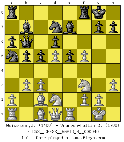 Last move : 1-0 2007 May 10 20:34:23 [Event "FICGS__CHESS__RAPID_B__000040"] [Site "FICGS"] [Date "2007.02.27"] [Round "1"] [White "Weidemann,Jaap"] [Black "Vranesh-Fallin,Scott"] [Result "1-0"] [WhiteElo "1400"] [BlackElo "1700"] 1.e4 e5 2.Nf3 Nc6 3.Bb5 a6 4.Ba4 Nf6 5.O-O Be7 6.Re1 b5 7.Bb3 O-O 8.c3 d6 9.h3 Bb7 10.d4 Na5 11.Bc2 c5 12.d5 Nd7 13.b3 Qb6 14.Nbd2 f5 15.exf5 1-0 This chess game has been lost on time (started : 2007.02.27 14:52:53) Ruy Lopez : Closed, 7...O-O Kingside Castling by player White (move 5) Kingside Castling by player Black (move 7) Player White won this chess game. Follow this game move after move (download)Chess opens and enriches your mind. (Saudin Robovic) Ich hatte Angst gegen einen russischen Großmeister zu verlieren, und er befürchtete gegen einen kleinen Jungen zu verlieren. (über ein Remis gegen Juri Awerbach). (Robert James Fischer) Puntos débiles o agujeros en la posición de tu oponente deben de ser ocupados por piezas, no Peones. (Siegbert Tarrasch) Des combinaisons [dans le jeu d'échecs] pareilles à des mélodies. Je crois entendre pour ainsi dire la musique des coups... (Vladimir Nabokov) Gambling is the son of avarice and the father of despair. (French proverb)