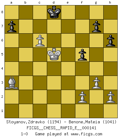 Last move : 1-0 2015 January 17 20:54:40 [Event "FICGS__CHESS__RAPID_E__000141"] [Site "FICGS"] [Date "2014.12.27"] [Round "1"] [White "Stoyanov,Zdravko"] [Black "Benone,Mateia"] [Result "1-0"] [WhiteElo "1194"] [BlackElo "1041"] 1.e4 c5 2.Nf3 Nc6 3.Bb5 e5 4.Bxc6 bxc6 5.d3 Qc7 6.O-O Nf6 7.Bg5 Be7 8.Nc3 O-O 9.a3 h6 10.Be3 d5 11.exd5 cxd5 12.Ne2 d4 13.Bd2 Bb7 14.Nh4 e4 15.Nf5 Bd6 16.Nxd6 Qxd6 17.Bf4 Qe6 18.dxe4 Nxe4 19.Re1 Qg6 20.Qd3 Ba6 21.Qf3 Nd2 22.Bxd2 Qxc2 23.Bf4 Rfe8 24.b4 Bxe2 25.Rxe2 Qxe2 26.Qxe2 Rxe2 27.bxc5 Rc8 28.Bd6 Rce8 29.g3 Re1+ 30.Rxe1 Rxe1+ 31.Kg2 Rc1 32.Kf3 f5 33.Ke2 Kf7 34.Kd3 Rc3+ 35.Kxd4 Rxa3 36.Kd5 Ke8 37.c6 Kd8 38.Bxa3 1-0 Sicilian : Nimzovich-Rossolimo attack (without ...d6) Kingside Castling by player White (move 6) Kingside Castling by player Black (move 8) Player White won this chess game. Follow this game move after move (download)A big shock; the best chess player in history has passed away. (Lajos Portisch, about Bobby Fischer's death) In Buenos Aires ist es nicht mein vorrangiges Ziel ein starkes Turnier zu organisieren, sondern ein Turnier für Gentlemen. Ich würde nie Kamsky einladen. Ich mag keine Probleme. (Miguel Najdorf) Preferería tener un Peón que un dedo. (Reuben Fine) Karpov est une pièce de musée. (Garry Kasparov) The greatest con, that he ever pulled... was making you believe... that he is you. (Revolver, movie)