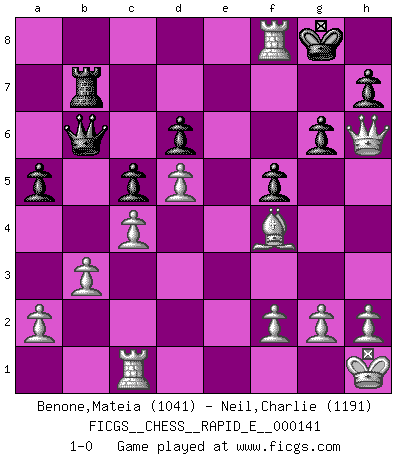 Last move : 1-0 2015 February 16 22:55:54 [Event "FICGS__CHESS__RAPID_E__000141"] [Site "FICGS"] [Date "2014.12.27"] [Round "1"] [White "Benone,Mateia"] [Black "Neil,Charlie"] [Result "1-0"] [WhiteElo "1041"] [BlackElo "1191"] 1.Nf3 c5 2.c4 Nc6 3.Nc3 Nf6 4.d4 cxd4 5.Nxd4 g6 6.e4 Bg7 7.Be2 a6 8.O-O Ne5 9.Bf4 Nc6 10.Rc1 O-O 11.Kh1 d6 12.Nxc6 bxc6 13.Bf3 Bb7 14.Qc2 c5 15.Rfd1 Qb6 16.b3 Rfc8 17.Nd5 Nxd5 18.exd5 Re8 19.Re1 Bc8 20.Qe2 Bd7 21.Bg4 Bxg4 22.Qxg4 Rab8 23.Qh4 a5 24.Rxe7 Rb7 25.Rxe8+ Bf8 26.Qh6 f5 27.Rxf8+ 1-0 Reti Opening Kingside Castling by player White (move 8) Kingside Castling by player Black (move 10) Player White won this chess game. Follow this game move after move (download)There is no remorse like the remorse of Chess. (H. G. Wells) Ich kämpfe solange mein Gegner einen Fehler machen kann. (Emanuel Lasker) Bobby Fischer es el jugador de Ajedrez mas grande que jamás haya existido. (Ken Smith) Le pion, dans sa simplicité, marche droit devant lui, mais lorsqu'il prend, il le fait obliquement? Ainsi l'homme, tant qu'il reste pauvre, marche dans la droiture et vit honnêtement, mais lorsqu'il recherche les honneurs, il flatte, se parjure et, par les voies obliques, cherche une position supérieure sur l'échiquier du monde. (Jean de Galles) That's absurd. I love it. (Gregory House, House M.D.)