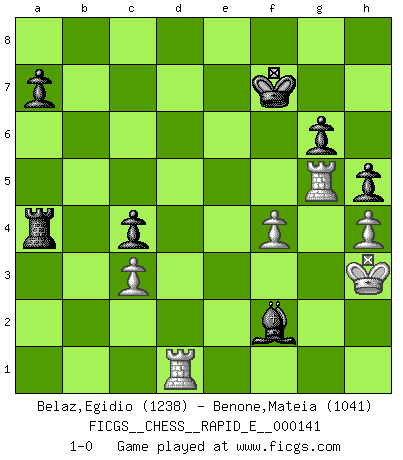 Last move : 1-0 2015 April 13 15:30:4 [Event "FICGS__CHESS__RAPID_E__000141"] [Site "FICGS"] [Date "2014.12.27"] [Round "1"] [White "Belaz,Egidio"] [Black "Benone,Mateia"] [Result "1-0"] [WhiteElo "1238"] [BlackElo "1041"] 1.e4 c5 2.Nf3 Nc6 3.Bc4 Nf6 4.Nc3 g6 5.Ng5 e6 6.O-O Bg7 7.d3 O-O 8.Re1 d5 9.exd5 exd5 10.Bb3 Bg4 11.Ne2 b5 12.f3 Bd7 13.c3 c4 14.dxc4 dxc4 15.Bc2 h6 16.Ne4 Nxe4 17.Bxe4 Rc8 18.Qd5 Qb6+ 19.Kh1 Be6 20.Qd2 Rfd8 21.Qc2 Ne5 22.Nf4 f5 23.Nxe6 Qxe6 24.Bf4 fxe4 25.Rxe4 Qf5 26.Bxe5 Bxe5 27.Rae1 Bf6 28.Qc1 Bg5 29.Qc2 Rd2 30.Qb1 Rcd8 31.b3 Qc5 32.bxc4 Qf2 33.Rg1 Rb2 34.Qf1 Qxf1 35.Rxf1 R8d2 36.Rg1 bxc4 37.a4 Bf6 38.Re3 Bd8 39.h3 Bh4 40.Re4 Bf2 41.Rf1 Bc5 42.Rg4 Kf7 43.h4 Bb6 44.Kh2 h5 45.Rg5 Ra2 46.f4 Rf2 47.Rd1 Rxf4 48.Kh3 Bf2 49.g3 Rxa4 50.gxf4 1-0 Sicilian defense Kingside Castling by player White (move 6) Kingside Castling by player Black (move 7) Player White won this chess game. Follow this game move after move (download)During a Chess competition a Chessmaster should be a combination of a beast of prey and a monk. (Alexander Alekhine) Smyslow ist ein Beweis dafür, dass ich noch zehn Jahre spielen kann! [der 75 jährige über den 85 jährigen] (Viktor Kortschnoi) El Ajedrez es una guerra en un tablero. El objetivo es aplastar la mente del oponente. (Bobby Fischer) Donnez-moi un Cavalier en 6e et je gagnerais toutes mes parties. (Steinitz) Big Chess is a place for big hallucinations. (Thibault de Vassal)