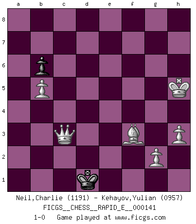 Last move : 1-0 2015 March 22 0:47:55 [Event "FICGS__CHESS__RAPID_E__000141"] [Site "FICGS"] [Date "2014.12.27"] [Round "1"] [White "Neil,Charlie"] [Black "Kehayov,Yulian"] [Result "1-0"] [WhiteElo "1191"] [BlackElo "0957"] 1.e4 e5 2.Nf3 d6 3.d4 Nc6 4.Bb5 Bd7 5.dxe5 dxe5 6.Nc3 Bd6 7.Be3 h6 8.h3 Nf6 9.Qd2 O-O 10.O-O a6 11.Be2 Na7 12.Rfd1 Bc6 13.Bd3 Nb5 14.Nxb5 axb5 15.a3 b6 16.b4 Bb7 17.Bxb5 Bxe4 18.c3 Bb7 19.Qc2 c6 20.Bc4 Qc7 21.Be2 Rfe8 22.c4 e4 23.Nd4 Bc8 24.Rac1 c5 25.Nb5 Qb8 26.Nxd6 Rd8 27.Nb5 Ba6 28.Qc3 Bxb5 29.cxb5 Nd5 30.Qb3 Nxe3 31.Qxe3 Rxd1+ 32.Rxd1 Qc7 33.bxc5 Qxc5 34.Qxe4 Qxa3 35.Qd5 Rf8 36.Qd6 Qa2 37.Re1 Re8 38.Kf1 Qe6 39.Qxe6 Rxe6 40.Bd3 Rxe1+ 41.Kxe1 f6 42.Ke2 Kf7 43.Kf3 Ke6 44.Kg4 Kf7 45.Be4 g6 46.f4 Ke6 47.Bxg6 Kd5 48.Kf5 Kc5 49.Be8 Kd4 50.Kxf6 Ke4 51.f5 Kf4 52.Kg6 Kg3 53.Bc6 Kf4 54.f6 Ke5 55.f7 Kd4 56.f8Q Ke3 57.Qb4 Ke2 58.Qc3 h5 59.Kxh5 Kd1 60.Bf3+ 1-0 Philidor's defense Kingside Castling by player Black (move 9) Kingside Castling by player White (move 10) 10 pieces endgame at move 47 : White KBPPPP , Black KPPP WHITE : King + 1 Bishop 4 Pawns BLACK : King + 3 Pawns 9 pieces endgame at move 50 : White KBPPPP , Black KPP WHITE : King + 1 Bishop 4 Pawns BLACK : King + 2 Pawns Promotion Queen by player White (move 56) 8 pieces endgame at move 59 : White KQBPPP , Black KP WHITE : King + 1 Queen 1 Bishop 3 Pawns BLACK : King + 1 Pawn Player White won this chess game. Follow this game move after move (download)Chess is in its essence a game, in its form an art, and in its execution a science. (Baron Tassilo) Bogoljubow: Matt in vier Zügen! Tartakower: Ich verbitte mir jede Belästigung! (Savielly Grigorievitsch Tartakower) Solo puedes ser bueno en el Ajedrez si amas al juego. (Bobby Fischer) Les échecs sont plus proches de l'art de l'assassinat que de l'art de la guerre. (Arturo Perez-Reverte) A mistake is only a mistake if you let it happen twice. Otherwise it is a learning experience. (Daniel Parmet)