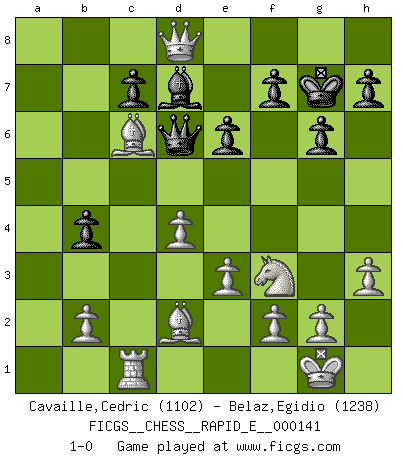 Last move : 1-0 2015 January 25 10:12:44 [Event "FICGS__CHESS__RAPID_E__000141"] [Site "FICGS"] [Date "2014.12.27"] [Round "1"] [White "Cavaille,Cedric"] [Black "Belaz,Egidio"] [Result "1-0"] [WhiteElo "1102"] [BlackElo "1238"] 1.d4 d5 2.Nf3 Nc6 3.e3 Bf5 4.Bd3 Bg4 5.h3 Be6 6.O-O Nf6 7.Bb5 Bd7 8.c4 dxc4 9.Bxc4 e6 10.Nc3 a6 11.Bd2 Be7 12.Re1 b5 13.Bd3 b4 14.Ne4 a5 15.a3 Nxe4 16.Bxe4 O-O 17.axb4 axb4 18.Rxa8 Bc8 19.Bxc6 Qd6 20.Qa4 g6 21.Rc1 Kg7 22.Rb8 Rd8 23.Qa8 Bd7 24.Rxd8 Bxd8 25.Qxd8 1-0 Queen's pawn game, Chigorin variation Kingside Castling by player White (move 6) Kingside Castling by player Black (move 16) Player White won this chess game. Follow this game move after move (download)Let the perfectionist play postal. (Yasser Seirawan) Man wirke der falschen Auffassung entgegen, als ob jeder Zug Unmittelbares zu leisten habe; auch Werte- und Ruhezüge haben ihre Existenzberechtigung. (Aaron Nimzowitsch) En el Ajedrez, cuando menos, el valiente hereda la tierra. (Edmar Mednis) On est toujours la mazette de quelqu'un d'autre. (Anonyme) Have no fear of perfection - you'll never reach it. (Salvador Dali)