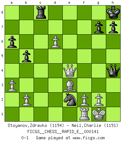 Last move : 0-1 2015 January 24 19:36:15 [Event "FICGS__CHESS__RAPID_E__000141"] [Site "FICGS"] [Date "2014.12.27"] [Round "1"] [White "Stoyanov,Zdravko"] [Black "Neil,Charlie"] [Result "0-1"] [WhiteElo "1194"] [BlackElo "1191"] 1.e4 e5 2.Nf3 Nc6 3.Bb5 a6 4.Bxc6 dxc6 5.h3 f6 6.d3 Be6 7.a3 Bd6 8.O-O Qd7 9.Kh2 Ne7 10.Nc3 O-O 11.Ne2 Ng6 12.c4 f5 13.exf5 Bxf5 14.Nh4 Nxh4 15.Ng3 Ng6 16.Qb3 b6 17.Nxf5 Qxf5 18.c5 Kh8 19.cxd6 cxd6 20.Be3 b5 21.Kg1 c5 22.Qd5 Qd7 23.Bxc5 Rad8 24.Bb6 Rc8 25.Rac1 Nf4 26.Qe4 Qe6 27.d4 Qh6 28.Rxc8 Rxc8 29.dxe5 Qg5 30.exd6 Nxh3+ 31.Kh1 Nf4 32.Be3 Qh4+ 33.Kg1 Ne2+ 0-1 Ruy Lopez : Exchange variation Kingside Castling by player White (move 8) Kingside Castling by player Black (move 10) Player Black won this chess game. Follow this game move after move (download)Many Chess players were surprised when after the game, Fischer quietly explained: 'I had already analyzed this possibility' in a position which I thought was not possible to foresee from the opening. (Mikhail Tal) Die unerbitterlichsten Regeln im Schach sind die Ausnahmen. (Savielly Grigorievitsch Tartakower) Una clavada es mas poderosa que una espada. (Fred Reinfeld) Les pièces de l'échiquier étaient impitoyables. Elles le retenaient, elles l'absorbaient. Il y avait de l'horreur en cela, mais aussi une harmonie unique. Car, qu'y a-t-il dans le monde, à part les échecs ? (V. Nabokov) The ultimate in disposing one's troops is to be without ascertainable shape. Then the most penetrating spies cannot pry in nor can the wise lay plans against you. (Sun Tzu)
