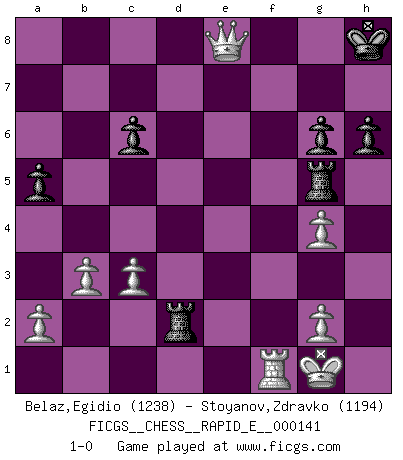 Last move : 1-0 2015 January 27 17:33:54 [Event "FICGS__CHESS__RAPID_E__000141"] [Site "FICGS"] [Date "2014.12.27"] [Round "1"] [White "Belaz,Egidio"] [Black "Stoyanov,Zdravko"] [Result "1-0"] [WhiteElo "1238"] [BlackElo "1194"] 1.e4 e5 2.f4 exf4 3.Nf3 a6 4.Bc4 Bd6 5.d4 Nc6 6.e5 Be7 7.Bxf4 h6 8.O-O d6 9.exd6 cxd6 10.Nc3 Nf6 11.Re1 O-O 12.b3 d5 13.Bd3 Bg4 14.h3 Nh5 15.hxg4 Nxf4 16.Bf1 Bh4 17.Re3 Ng6 18.Nxh4 Qxh4 19.Nxd5 Rad8 20.Rh3 Qg5 21.Rh5 Rxd5 22.Rxg5 Rxg5 23.Bd3 Nf4 24.Be4 Re8 25.Bf5 g6 26.Bd7 Rd8 27.Bxc6 bxc6 28.Qf3 Rxd4 29.c3 Ne2+ 30.Qxe2 Rd8 31.Rf1 a5 32.Qe7 Rd2 33.Qxf7+ Kh8 34.Qe8+ 1-0 King's knight's gambit Kingside Castling by player White (move 8) Kingside Castling by player Black (move 11) Player White won this chess game. Follow this game move after move (download)Every Chess master was once a beginner. (Chernev) Kostenjuk hat keinen Sexappeal. (Loek van Wely) Bobby Fischer es el jugador de Ajedrez mas grande que jamás haya existido. (Ken Smith) Votre seul travail dans les ouvertures est d'obtenir un milieu de partie jouable. (Lajos Portish) Those parts of the system that you can hit with a hammer (not advised) are called hardware; those program instructions that you can only curse at are called software. (Anonymous)
