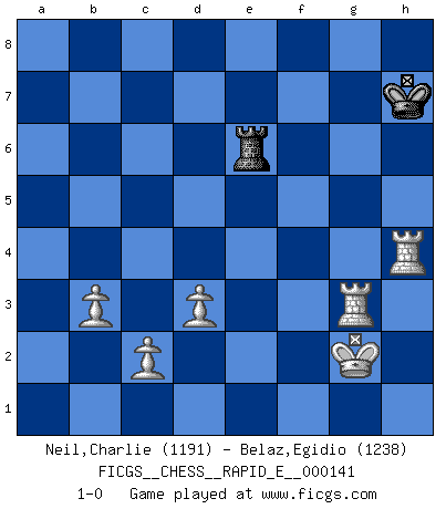 Last move : 1-0 2015 April 6 9:44:8 [Event "FICGS__CHESS__RAPID_E__000141"] [Site "FICGS"] [Date "2014.12.27"] [Round "1"] [White "Neil,Charlie"] [Black "Belaz,Egidio"] [Result "1-0"] [WhiteElo "1191"] [BlackElo "1238"] 1.e4 c5 2.Nf3 d6 3.Bb5+ Bd7 4.Bxd7+ Nxd7 5.d3 Ngf6 6.O-O e5 7.Bg5 Be7 8.Nc3 O-O 9.Re1 a6 10.a4 Qb6 11.Rb1 Rfe8 12.Bd2 Qc6 13.Qe2 b5 14.axb5 axb5 15.Nd1 b4 16.b3 Ra2 17.Ne3 R2a8 18.Nc4 Nb6 19.Nxb6 Qxb6 20.Nh4 d5 21.exd5 Nxd5 22.Nf5 Bf6 23.Qf3 Qe6 24.Qg4 g6 25.Nh6+ Kg7 26.Qxe6 Rxe6 27.Ng4 Bh4 28.Nxe5 Bf6 29.f4 Bh4 30.Re2 Nc3 31.Bxc3 bxc3 32.Re4 Rc8 33.Rc4 Bd8 34.Rxc3 Ba5 35.Rc4 Bd2 36.g3 f6 37.Nd7 Be3+ 38.Kg2 Rd6 39.Re1 Rxd7 40.Rxe3 Rd5 41.Re7+ Kh6 42.Ra7 Re8 43.Kf2 Rc8 44.Re4 Rh8 45.Re6 f5 46.Rc6 Kh5 47.Rac7 h6 48.Rxc5 Rd6 49.R7c6 Rd7 50.Kf3 Rf8 51.Rc7 Rd6 52.R7c6 Rd4 53.Re6 g5 54.fxg5 hxg5 55.h3 g4+ 56.hxg4+ Rxg4 57.R6e5 Rg5 58.Rc4 Kh6 59.Rc6+ Kh5 60.Re1 Rg4 61.Rh1+ Kg5 62.R1h6 f4 63.Rhg6+ Kh5 64.Rxg4 fxg3 65.Kxg3 Rf1 66.Rc5+ Kh6 67.Rc8 Kh7 68.Kg2 Rf7 69.Rg3 Re7 70.Rc4 Re6 71.Rh4+ 1-0 Sicilian : Canal-Sokolsky attack, 3...Bd7 Kingside Castling by player White (move 6) Kingside Castling by player Black (move 8) 10 pieces endgame at move 64 : White KRRPPPP , Black KRP WHITE : King + 2 Rooks 4 Pawns BLACK : King + 1 Rook 1 Pawn 9 pieces endgame at move 64 : White KRRPPP , Black KRP WHITE : King + 2 Rooks 3 Pawns BLACK : King + 1 Rook 1 Pawn 8 pieces endgame at move 65 : White KRRPPP , Black KR WHITE : King + 2 Rooks 3 Pawns BLACK : King + 1 Rook Player White won this chess game. Follow this game move after move (download)In blitz, the Knight is stronger than the Bishop. (Vlastimil Hort) Darum geht es im Schach. Einen Tag gibst du deinem Gegner eine Lektion, am nächsten Tag gibt er dir eine. (Robert James Fischer) El juego de Fischer siempre fue nítido, racional y brillante. Uno de los mejores por siempre. (Dave Regis) Il s'avisa de me proposer d'apprendre les échecs qu'il jouait un peu... me voilà forcené des échecs. J'achète un échiquier, je m'enferme dans ma chambre, j'y passe des jours et des nuits à vouloir apprendre par cur toutes les parties. (Jean-Jacques Rousseau, Confessions) Just because you do not take an interest in politics doesn't mean politics won't take an interest in you. (Pericles 430 B.C.)