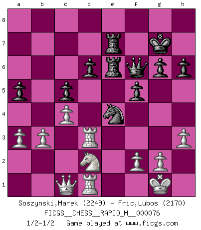 Last move : 1/2-1/2 2015 March 22 19:38:1 [Event "FICGS__CHESS__RAPID_M__000076"] [Site "FICGS"] [Date "2014.12.27"] [Round "1"] [White "Soszynski,Marek"] [Black "Fric,Lubos"] [Result "1/2-1/2"] [WhiteElo "2249"] [BlackElo "2170"] 1.e4 c5 2.b3 Nc6 3.Nf3 d6 4.Bb5 Bd7 5.O-O Nf6 6.Re1 g6 7.Bb2 Bg7 8.d4 cxd4 9.Nxd4 O-O 10.Bxc6 bxc6 11.Nf3 Re8 12.c4 Qa5 13.Bc3 Qb6 14.e5 Ng4 15.Rf1 Rad8 16.exd6 exd6 17.Bxg7 Kxg7 18.Qd2 c5 19.Nc3 Bc6 20.Rad1 Qc7 21.Nd5 Bxd5 22.Qc3+ Nf6 23.Rxd5 h6 24.Rd3 Re6 25.h3 Kh7 26.Rfd1 Rde8 27.Nh2 Qe7 28.Nf1 Ne4 29.Qc2 f5 30.Nh2 Qf6 31.a3 a5 32.Nf3 Kg7 33.Qc1 R8e7 34.Nd2 1/2-1/2 Sicilian defense Kingside Castling by player White (move 5) Kingside Castling by player Black (move 9) This chess game ended in a draw. Follow this game move after move (download)Avoid the crowd. Do your own thinking independently. Be the Chess player, not the Chess piece. (Ralph Charell) Die meiste Zeit treffe ich auf Gegner, die meine Enkel sein könnten. Ich bin da, um ihnen zu zeigen, dass sie von mir noch einiges lernen können. (Viktor Kortschnoi) Cuando le juegas a Fischer, no es una cuestion de si vas a ganar o perder. Es una cuestion de si vas a sobrevivir. (Boris Spassky) Des points faibles ou des trous dans la position de l'adversaire doivent être occupés par des pièces et non pas par des pions. (Siegbert Tarrasch) The leaves of memory seemed to make a mournful rustling in the dark. (Henry Wadsworth Longfellow)