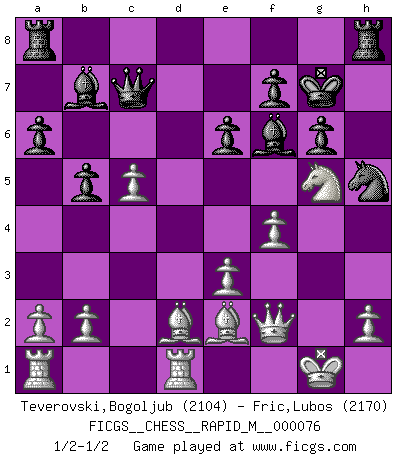 Last move : 1/2-1/2 2015 May 9 1:13:56 [Event "FICGS__CHESS__RAPID_M__000076"] [Site "FICGS"] [Date "2014.12.27"] [Round "1"] [White "Teverovski,Bogoljub"] [Black "Fric,Lubos"] [Result "1/2-1/2"] [WhiteElo "2104"] [BlackElo "2170"] 1.d4 d5 2.c4 c6 3.Nf3 Nf6 4.Nc3 e6 5.e3 Nbd7 6.Qc2 Bd6 7.Be2 dxc4 8.Bxc4 b5 9.Be2 O-O 10.O-O a6 11.Rd1 Qc7 12.Ne4 Nxe4 13.Qxe4 Bb7 14.Bd3 g6 15.Qh4 c5 16.Ng5 h5 17.g4 Nf6 18.gxh5 Nxh5 19.Be2 Kg7 20.dxc5 Be5 21.f4 Bf6 22.Bd2 Rh8 23.Qf2 1/2-1/2 QGD Slav : 4.Nc3 Kingside Castling by player Black (move 9) Kingside Castling by player White (move 10) This chess game ended in a draw. Follow this game move after move (download)I play correspondence chess because it is both art and science while chess is art only. (A player at FICGS) Ich spiele 70 Eröffnungssysteme. (Viktor Kortschnoi) Una partida de Ajedrez se divide en 3 etapas: la primera cuando piensas que tienes la ventaja, la segunda cuando crees que tienes la ventaja y la tercera... ¡cuando te das cuenta que vas a perder!. (Savielly Tartakower) Même si l'adversaire joue le coup analysé précédemment, recommencez l'analyse en voyant la nouvelle position. Première règle de Blumenfeld The beginning of wisdom is silence. The second step is listening. (Unknown)