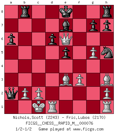 Last move : 1/2-1/2 2015 February 2 9:42:29 [Event "FICGS__CHESS__RAPID_M__000076"] [Site "FICGS"] [Date "2014.12.27"] [Round "1"] [White "Nichols,Scott"] [Black "Fric,Lubos"] [Result "1/2-1/2"] [WhiteElo "2243"] [BlackElo "2170"] 1.e4 c5 2.Nf3 d6 3.d4 cxd4 4.Nxd4 Nf6 5.Nc3 a6 6.f3 e5 7.Nb3 Be6 8.Be3 Nbd7 9.g4 b5 10.g5 Nh5 11.Qd2 Nb6 12.Na5 b4 13.Nd5 Nxd5 14.exd5 Qxa5 15.dxe6 fxe6 16.Bh3 Qd5 17.O-O-O Qxa2 18.Qxb4 Be7 19.Qg4 Rb8 20.Qxe6 1/2-1/2 Sicilian : Najdorf Queenside Castling by player White (move 17) This chess game ended in a draw. Follow this game move after move (download)It is not a move, even the best move that you must seek, but a realizable plan. (Eugene Znosko-Borovsky) Gott hat gewollt, dass ich Champion werde. (Surab Azmajparaschvili) No es una movida, aún la mejor movida que tu debas buscar, sino un plan comprensible. (Eugene Znosko-Borovsky) Nous sommes les pions de la mystérieuse partie d'Echecs jouée par Dieu. Il nous déplace, nous arrête, nous pousse encore, puis nous lance un à un dans la boîte du Néant. Epitaphe sur la tombe de David Janowsky (1868-1927). A computer lets you make more mistakes faster than any invention in human history - with the possible exceptions of handguns and tequila. (Mitch Ratcliffe)