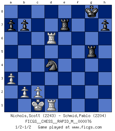 Last move : 1/2-1/2 2015 February 26 19:27:23 [Event "FICGS__CHESS__RAPID_M__000076"] [Site "FICGS"] [Date "2014.12.27"] [Round "1"] [White "Nichols,Scott"] [Black "Schmid,Pablo"] [Result "1/2-1/2"] [WhiteElo "2243"] [BlackElo "2204"] 1.e4 c5 2.Nf3 d6 3.d4 cxd4 4.Nxd4 Nf6 5.Nc3 g6 6.Be3 Bg7 7.f3 O-O 8.Qd2 Nc6 9.g4 Be6 10.Nxe6 fxe6 11.O-O-O Ne5 12.Be2 Qc8 13.h4 Nfd7 14.f4 Nc4 15.Bxc4 Qxc4 16.e5 Rad8 17.exd6 Nf6 18.Qd4 Qxd4 19.Bxd4 Rxd6 20.g5 Ne8 21.Bxg7 Nxg7 22.Ne2 Nf5 23.Rde1 Ra6 24.a3 Ra4 25.Rd1 Re4 26.Rh2 e5 27.fxe5 Rxe5 28.Nf4 Re4 29.Nd5 Rf7 30.h5 gxh5 31.Rxh5 Nd4 32.Rh6 Rg7 33.Rd6 Rxg5 34.Nxe7+ Rxe7 1/2-1/2 Sicilian : Dragon, Yugoslav attack, 7...O-O Kingside Castling by player Black (move 7) Queenside Castling by player White (move 11) This chess game ended in a draw. Follow this game move after move (download)Chess is mental torture. (Garry Kasparov) Pläne sind die Träume des Verständigen. (Ernst Freiherr von Feuchtersleben) Bendita sea la memoria de aquel que dio al mundo este juego inmortal. (A. G. Gardiner) D'abord les bases : Jouez et étudiez, puis étudiez et jouez, ensuite jouez et étudiez, puis étudiez et jouez. Deuxièmement : Donnez toujours le meilleur de vous-même ! (Ken Smith) Optimism is a variety of information deficit. Sometimes especially true for correspondence chess games. (Michael Aigner)