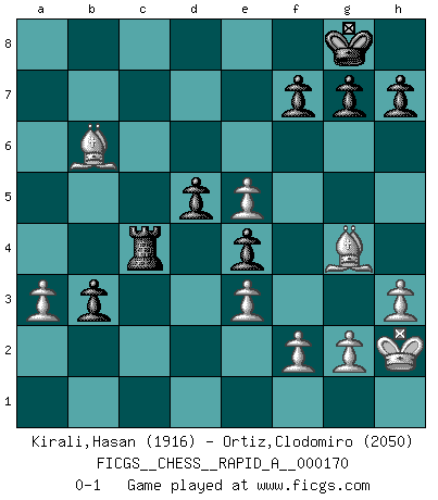 Last move : 0-1 2015 March 17 22:50:9 [Event "FICGS__CHESS__RAPID_A__000170"] [Site "FICGS"] [Date "2014.12.30"] [Round "1"] [White "Kirali,Hasan"] [Black "Ortiz,Clodomiro"] [Result "0-1"] [WhiteElo "1916"] [BlackElo "2050"] 1.d4 Nf6 2.c4 e6 3.Nf3 c6 4.Nc3 d5 5.e3 Nbd7 6.Qc2 Be7 7.Be2 b6 8.cxd5 cxd5 9.Bd2 Bb7 10.O-O O-O 11.Rac1 Ne4 12.Nxe4 dxe4 13.Ne5 Nxe5 14.dxe5 Qd5 15.Bc3 Qxa2 16.Ra1 Qd5 17.Qa4 Bc6 18.Qc2 a5 19.Rac1 Rfc8 20.Rfd1 Qc5 21.Qb1 a4 22.h3 b5 23.Bd4 Qb4 24.Rc2 Bd5 25.Rdc1 Rxc2 26.Qxc2 Qa5 27.Qc7 Qxc7 28.Rxc7 Bd8 29.Rd7 b4 30.Bc5 Ba5 31.Bg4 a3 32.bxa3 b3 33.Bd4 Rc8 34.Kh2 Bb6 35.Rxd5 exd5 36.Bxb6 Rc4 0-1 Queen's pawn game Kingside Castling by player White (move 10) Kingside Castling by player Black (move 10) Player Black won this chess game. Follow this game move after move (download)Chess demands total concentration. (Bobby Fischer) Man braucht nicht immer den besten Zug zu spielen: Ein Zug muß aktiv, unternehmungslustig, korrekt und schön sein. (David Bronstein) El Ajedrez, como la música, como el amor, tiene el poder de hacer feliz a la gente. (Siegbert Tarrasch) Toutes les manuvres exécutées sur une colonne ouverte ont pour but ultime l'intrusion définitive sur la septième ou la huitième rangée, en plein cur de la position ennemie. (Aaron Nimzovitch) I couldn't make any sense out of what this particular thread is about. It sounds like R2 D2 computer speaking. A space fight ?!? Some 'command' problems in Moscow ? Some killers & narcotic addicts attacking some game & a god wannabe ?? (Dinesh De Silva, lost in a russian conflict in FICGS forum)