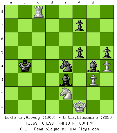Last move : 0-1 2015 April 5 22:20:4 [Event "FICGS__CHESS__RAPID_A__000170"] [Site "FICGS"] [Date "2014.12.30"] [Round "1"] [White "Bukharin,Alexey"] [Black "Ortiz,Clodomiro"] [Result "0-1"] [WhiteElo "1900"] [BlackElo "2050"] 1.d4 Nf6 2.c4 e6 3.Nc3 Bb4 4.e3 O-O 5.Nge2 d5 6.a3 Bd6 7.Ng3 b6 8.cxd5 exd5 9.Be2 Re8 10.O-O a5 11.Re1 Bb7 12.Nf5 Bf8 13.Qc2 g6 14.Ng3 c5 15.dxc5 bxc5 16.Rd1 Nc6 17.Na4 Ne5 18.Bb5 Re6 19.b3 Rc8 20.h3 Qe7 21.Rb1 d4 22.f4 Ned7 23.Bc4 Rxe3 24.Bxe3 Qxe3+ 25.Qf2 Qxf2+ 26.Kxf2 Bc6 27.Kg1 Rb8 28.Ne2 Nd5 29.Bxd5 Bxd5 30.Nc1 Bc6 31.Nb2 a4 32.b4 cxb4 33.axb4 Rxb4 34.Ncd3 Rb3 35.Nc4 Rxb1 36.Rxb1 Be4 37.Rd1 a3 38.Nf2 Bd5 39.Nxa3 Bxa3 40.Rxd4 Nb6 41.Ne4 Kg7 42.Rd3 Be7 43.Nc3 Bc6 44.g3 Bc5+ 45.Kh2 h5 46.Rd8 Kf6 47.h4 Kf5 48.Kh3 Bd7 49.Rb8 Bg1 50.Rf8 Ke6 51.Kg2 Bd4 52.Ne2 Bc5 53.Rh8 Nd5 54.Rb8 Ne3+ 55.Kh2 Kd5 56.Rd8 Ng4+ 57.Kh3 Nf6 58.Kg2 Kc4 59.Ng1 Bc6+ 60.Kf1 Bh1 61.Ne2 Ne4 62.f5 gxf5 63.Rg8 Bf3 64.Nf4 Be3 65.Ne2 Bg4 66.Rc8+ Kb4 0-1 Nimzo-Indian : 4.e3 O-O Kingside Castling by player Black (move 4) Kingside Castling by player White (move 10) Player Black won this chess game. Follow this game move after move (download)In Chess, at least, the brave inherit the earth. (Edmar Mednis) Woher wissen wir, daß der Neanderthaler Blindschach gespielt hat? -- Bei Ausgrabungen wurden keine Schachbretter und Figuren gefunden. (Anonymous) Aquellos que dicen entender al Ajedrez, no entienden nada. (Robert Hubner) Le génie consiste à savoir transgresser les règles au moment opportun. (Teichmann) Industry executives and analysts often mistakenly talk about strategy as if it were some kind of chess match. But in chess, you have just two opponents, each with identical resources, and with luck playing a minimal role. The real world is much more like a poker game, with multiple players trying to make the best of whatever hand fortune has dealt them. In our industry, Bill Gates owns the table until someone proves otherwise. (David Moschella, 'Computerworld')