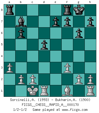 Last move : 1/2-1/2 2015 April 6 7:33:44 [Event "FICGS__CHESS__RAPID_A__000170"] [Site "FICGS"] [Date "2014.12.30"] [Round "1"] [White "Sorcinelli,Andrea"] [Black "Bukharin,Alexey"] [Result "1/2-1/2"] [WhiteElo "1993"] [BlackElo "1900"] 1.e4 c5 2.Nf3 d6 3.d4 cxd4 4.Nxd4 Nf6 5.Nc3 g6 6.Be3 Bg7 7.f3 Nc6 8.Qd2 O-O 9.O-O-O d5 10.exd5 Nxd5 11.Nxc6 bxc6 12.Bd4 Bxd4 13.Qxd4 Qb6 14.Nxd5 cxd5 15.Qxb6 axb6 16.a3 Bb7 1/2-1/2 Sicilian : Dragon, Yugoslav attack Kingside Castling by player Black (move 8) Queenside Castling by player White (move 9) This chess game ended in a draw. Follow this game move after move (download)Fischer, who may or may not be mad as a hatter, has every right to be horrified. (Jeremy Silman) Ich spiele ehrlich und spiele, um zu gewinnen. Wenn ich verliere nehme ich meine Medizin. (Robert James Fischer) Con o sin el título, Bobby Fischer fue sin lugar a dudas el mas grande jugador de su época. (Burt Hochberg) Nous sommes les pions de la mystérieuse partie d'Echecs jouée par Dieu. Il nous déplace, nous arrête, nous pousse encore, puis nous lance un à un dans la boîte du Néant. Epitaphe sur la tombe de David Janowsky (1868-1927). Hardware: the parts of a computer that can be kicked. (Jeff Persis)