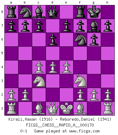 Last move : 0-1 2015 February 14 19:31:36 [Event "FICGS__CHESS__RAPID_A__000170"] [Site "FICGS"] [Date "2014.12.30"] [Round "1"] [White "Kirali,Hasan"] [Black "Reboredo,Daniel"] [Result "0-1"] [WhiteElo "1916"] [BlackElo "1941"] 1.d4 Nf6 2.c4 g6 3.Nf3 Bg7 4.Nc3 O-O 5.e4 d6 0-1 This chess game has been lost on time (started : 2014.12.30 14:49:23) King's Indian, 3.Nf3 Kingside Castling by player Black (move 4) Player Black won this chess game. Follow this game move after move (download)My style is somewhere between that of Tal and Petrosian. (Reshevsky) Die Partien sind immer verschieden, die Interviews immer die gleichen. (Garry Kasparov) El Ajedrez es un cuento de Hadas de las 1001 metidas de pata. (Savielly Tartakower) Mon pion favori sur ma case favorite ! Bronstein en parlant d'un coup de pion en h5 quand il avait les Noirs. Ah, the Socrating method. The best way we have of teaching everything-apart from juggling chainsaws. (Gregory House, House M.D.)