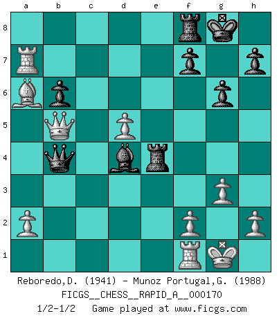 Last move : 1/2-1/2 2015 February 1 21:5:11 [Event "FICGS__CHESS__RAPID_A__000170"] [Site "FICGS"] [Date "2014.12.30"] [Round "1"] [White "Reboredo,Daniel"] [Black "Munoz Portugal,Guillermo"] [Result "1/2-1/2"] [WhiteElo "1941"] [BlackElo "1988"] 1.e4 c5 2.Nf3 Nc6 3.d4 cxd4 4.Nxd4 g6 5.c4 Nf6 6.Nc3 Bg7 7.Be3 Ng4 8.Qxg4 Nxd4 9.Qd1 Ne6 10.Rc1 b6 11.b4 O-O 12.Nd5 Nc7 13.Be2 Nxd5 14.cxd5 e6 15.O-O Bb7 16.Bf4 Re8 17.Rc7 e5 18.Bxe5 Rxe5 19.Rxb7 Qc8 20.Ba6 Rxe4 21.Qa4 Qc3 22.Qxd7 Rf8 23.Rxa7 Qxb4 24.g3 Bd4 25.Qb5 1/2-1/2 Sicilian : Accelerated Fianchetto, Maroczy bind Kingside Castling by player Black (move 11) Kingside Castling by player White (move 15) This chess game ended in a draw. Follow this game move after move (download)The beauty of a move lies not in its' appearance but in the thought behind it. (Siegbert Tarrasch) Es ist peinlich, dass ich nie Weltmeister wurde. Es wäre leicht, Leonid Breschnjew als Ursache vorzuschieben, dessen Apparat den Vorzeigekommunisten Anatoli Karpow in allem unterstützte. Aber Garri Kasparow zum Beispiel, der ebenfalls von den Sowjets unerwünscht war, hat trotz der Widerstände den WM-Titel erobert. (Viktor Kortschnoi) Fischer es una tragedia del Ajedrez Americano a la par con Morphy y Pillsbury. (Mig Greengard) La tactique est l'élément le plus important du milieu de jeu. (Siegbert Tarrasch) Over-the-board chess is the favorite of mortals, correspondence chess is the favorite of the gods. (Eduard Dyckhoff)