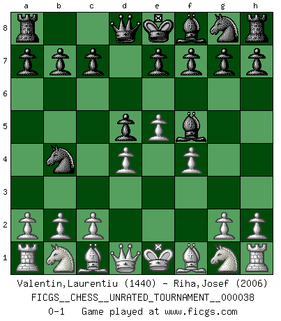 Last move : 0-1 2015 February 9 19:47:18 [Event "FICGS__CHESS__UNRATED_TOURNAMENT__000038"] [Site "FICGS"] [Date "2014.12.30"] [Round "1"] [White "Valentin,Laurentiu"] [Black "Riha,Josef"] [Result "0-1"] [WhiteElo "1440"] [BlackElo "2006"] 1.e4 Nc6 2.d4 d5 3.e5 Bf5 4.f4 Nb4 0-1 This chess game has been lost on time (started : 2014.12.30 20:32:54) KP : Nimzovich defense Player Black won this chess game. Follow this game move after move (download)Don't even mention losing to me. I can't stand to think of it. (Bobby Fischer) Ich verachte Kasparow. (Viktor Kortschnoi) El Ajedrez detiene a su maestro dentro de sus propios vínculos, encadenando la mente y el cerebro, por lo que la libertad interior del mas fuerte debe sufrir. (Albert Einstein) Le génie consiste à savoir transgresser les règles au moment opportun. (Teichmann) The next best thing to gambling and winning is gambling and loosing. (Nick Dandalos)