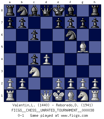 Last move : 0-1 2015 February 9 19:47:18 [Event "FICGS__CHESS__UNRATED_TOURNAMENT__000038"] [Site "FICGS"] [Date "2014.12.30"] [Round "1"] [White "Valentin,Laurentiu"] [Black "Reboredo,Daniel"] [Result "0-1"] [WhiteElo "1440"] [BlackElo "1941"] 1.d4 d5 2.c4 c6 3.Nc3 Nf6 4.Bg5 dxc4 0-1 This chess game has been lost on time (started : 2014.12.30 20:32:54) QGD Slav defense Player Black won this chess game. Follow this game move after move (download)There's never before been a Chess player with such a thorough knowledge of the intricacies of the game and such an absolutely indomitable will to win. I think Bobby is the greatest player that ever lived. (Lisa Lane) Im Fernschach kannst du während dem Spiel rauchen. (John Christen Knudsen) Tu no necesitas jugar muy bien, únicamente ayudar a tu oponenet a que juegue muy mal. (Genrikh Chepukaitis) Il (Jacob Murray) ne joue pas pour le bon coup, mais pour le meilleur. (Eloi Relange) Man is reluctant to give credit for intelligence to anyone, except his enemies. (Albert Einstein)