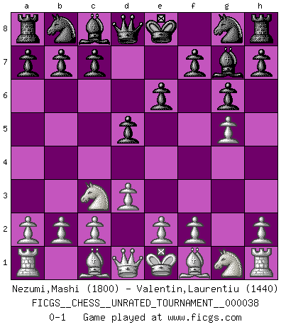 Last move : 0-1 2015 February 26 20:24:19 [Event "FICGS__CHESS__UNRATED_TOURNAMENT__000038"] [Site "FICGS"] [Date "2014.12.30"] [Round "1"] [White "Nezumi,Mashi"] [Black "Valentin,Laurentiu"] [Result "0-1"] [WhiteElo "1800"] [BlackElo "1440"] 1.g4 d5 2.g5 g6 3.d3 Bg7 4.Nc3 e6 0-1 This chess game has been lost on time (started : 2014.12.30 20:32:54) Grob's attack Player Black won this chess game. Follow this game move after move (download)Later, I began to succeed in decisive games. Perhaps because I realized a very simple truth: not only was I worried, but also my opponent. (Mikhail Tal) Immer nach dem besten Zug zu suchen ist ziemlich unpraktisch. (Nigel Short) El Ajedrez es un invernadero donde los frutos del carácter pueden madurar mas completamente que en la vida. (Edward Morgan Foster) La victoire dans une partie d'Echecs appartient la plupart du temps à celui qui voit un peu plus loin que l'adversaire. (Lasker) I've never seen so many men wasted so badly. (Blondie in The Good, The Bad and The Ugly)