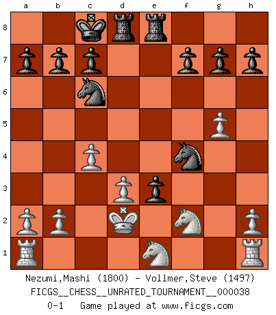 Last move : 0-1 2015 January 15 0:26:56 [Event "FICGS__CHESS__UNRATED_TOURNAMENT__000038"] [Site "FICGS"] [Date "2014.12.30"] [Round "1"] [White "Nezumi,Mashi"] [Black "Vollmer,Steve"] [Result "0-1"] [WhiteElo "1800"] [BlackElo "1497"] 1.g4 e5 2.d3 Nc6 3.g5 Bc5 4.e4 d5 5.Bg2 dxe4 6.Bxe4 Be6 7.f4 Qd7 8.f5 Bxf5 9.Bxf5 Qxf5 10.Qf3 Nge7 11.Qxf5 Nxf5 12.Nc3 O-O-O 13.Nf3 Rhe8 14.Ne4 Be3 15.Bxe3 Nxe3 16.Kd2 Nd5 17.c4 Nf4 18.Nf2 e4 19.Ne1 e3+ 0-1 Grob's attack Queenside Castling by player Black (move 12) Player Black won this chess game. Follow this game move after move (download)If Chess is a science, it's a most inexact one. If Chess is an art, it is too exacting to be seen as one. If Chess is a sport, it's too esoteric. If Chess is a game, it's too demanding to be just a game. If Chess is a mistress, she's a demanding one. If Chess is a passion, it's a rewarding one. If Chess is life, it's a sad one. (Unknown) Versuche, dich von der Sklaverei der Eröffnungsvarianten zu befreien. Stattdessen soll man gewisse Typenpositionen erlernen, die man eingehend analysiert. (Aaron Nimzowitsch) Los Peones son el alma de una partida de Ajedrez. (Francois Andre Danican Philidor) On est toujours la mazette de quelqu'un d'autre. (Anonyme) Luck has a peculiar habit of favoring those who don't depend on it. (Author unknown)