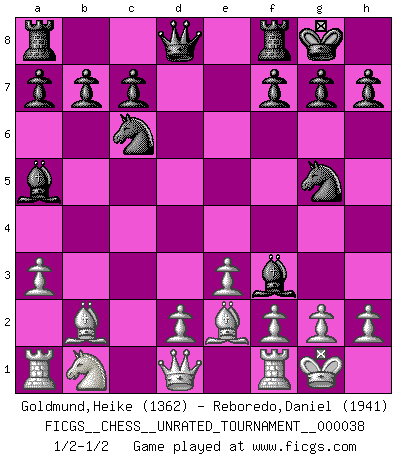 Last move : 1/2-1/2 2015 February 19 20:35:38 [Event "FICGS__CHESS__UNRATED_TOURNAMENT__000038"] [Site "FICGS"] [Date "2014.12.30"] [Round "1"] [White "Goldmund,Heike"] [Black "Reboredo,Daniel"] [Result "1/2-1/2"] [WhiteElo "1362"] [BlackElo "1941"] 1.b4 e5 2.Bb2 Bxb4 3.Bxe5 Nf6 4.c4 O-O 5.a3 Ba5 6.e3 Nc6 7.Bb2 d5 8.Nf3 Ne4 9.Be2 dxc4 10.Bxc4 Bg4 11.O-O Ng5 12.Be2 Bxf3 1/2-1/2 Polish (Sokolsky) opening Kingside Castling by player Black (move 4) Kingside Castling by player White (move 11) This chess game ended in a draw. Follow this game move after move (download)I'm not a materialistic person, in that, I don't suffer the lack or loss of money. The absence of worldly goods I don't look back on. For Chess is a way I can be as materialistic as I want without having to sell my soul. (Jamie Walter Adams) Ich würde die 30 stärksten Spieler der USA im Simultanspiel besiegen. (José Raúl Capablanca) Un mal plan es mejor que no tener ningún plan. (Frank Marshall) Ce qui est bien, c'est d'avoir tout un tas de pièces en prise : l'adversaire ne peut en prendre qu'une à la fois. Cité par Thierry Audin. They misunderestimated me. (George W. Bush, Bentonville nov. 6, 2000)
