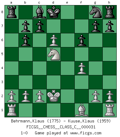 Last move : 1-0 2007 March 31 12:45:40 [Event "FICGS__CHESS__CLASS_C__000031"] [Site "FICGS"] [Date "2007.02.27"] [Round "1"] [White "Behrmann,Klaus"] [Black "Kuuse,Klaus"] [Result "1-0"] [WhiteElo "1775"] [BlackElo "1959"] 1.e4 e5 2.Nf3 Nc6 3.d4 exd4 4.Nxd4 Nxd4 5.Qxd4 Qf6 6.e5 Qb6 7.Qxb6 axb6 8.Nc3 Bb4 9.Bd2 f6 10.f4 d6 11.Nd5 Bxd2+ 12.Kxd2 Kd8 13.exd6 1-0 Scotch game Player White won this chess game. Follow this game move after move (download)In the perfect Chess combination as in a first-rate short story, the whole plot and counter-plot should lead up to a striking finale, the interest not being allayed until the very last moment. (Yates and Winter) Wenn man heute mit 14 Jahren noch kein GM ist, kann man es vergessen. (Viswanathan Anand) Por la belleza de sus partidas, la claridad de su juego y lo brillante de sus ideas, Fischer se creó el mismo como un artista de la misma estatura como Brahms, Rembrandt y Shakespeare. (David Levy) Nous vivons dans un monde échiquéen : chaque jour qui passe est un défi à relever. (Philosophe Sasha) You think that education is too expensive ? Try ignorance. (Derek Bok)