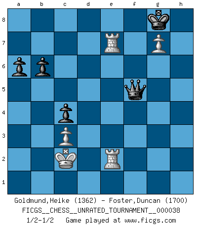 Last move : 1/2-1/2 2015 May 7 16:50:54 [Event "FICGS__CHESS__UNRATED_TOURNAMENT__000038"] [Site "FICGS"] [Date "2014.12.30"] [Round "1"] [White "Goldmund,Heike"] [Black "Foster,Duncan"] [Result "1/2-1/2"] [WhiteElo "1362"] [BlackElo "1700"] 1.e4 b6 2.Nf3 Bb7 3.Nc3 a6 4.a4 d6 5.Bc4 e6 6.O-O g6 7.d4 Bg7 8.Re1 Ne7 9.Bg5 h6 10.Bh4 g5 11.Bg3 O-O 12.e5 Nf5 13.Ne2 Bxf3 14.gxf3 d5 15.Bd3 Nc6 16.Bxf5 exf5 17.f4 h5 18.h3 h4 19.Bh2 f6 20.Qd2 Bh6 21.Kh1 Kh7 22.Rg1 fxe5 23.fxg5 Bg7 24.dxe5 Nxe5 25.Bxe5 Bxe5 26.g6+ Kg7 27.c3 Qd6 28.f4 Bf6 29.Nd4 Bxd4 30.Qxd4+ Kg8 31.Rae1 c5 32.Qf2 Qf6 33.Rg5 Kg7 34.Qxh4 Rh8 35.Qg3 Rh6 36.Qd3 d4 37.Rxf5 Qc6+ 38.Re4 Rxh3+ 39.Qxh3 Rh8 40.Qxh8+ Kxh8 41.Rfe5 Qxa4 42.Re7 Qd1+ 43.Re1 Qf3+ 44.Kg1 Qg4+ 45.Kf2 Qxf4+ 46.Ke2 dxc3 47.bxc3 Qc4+ 48.Kd2 Qf4+ 49.Kc2 Qf5+ 50.Kb3 Kg8 51.g7 Qd5+ 52.Kb2 c4 53.R1e2 Qb5+ 54.Kc2 Qf5+ 1/2-1/2 Owen defense Kingside Castling by player White (move 6) Kingside Castling by player Black (move 11) 10 pieces endgame at move 47 : White KRRPP , Black KQPPP WHITE : King + 2 Rooks 2 Pawns BLACK : King + 1 Queen 3 Pawns This chess game ended in a draw. Follow this game move after move (download)Via the squares on the chessboard, the Indians explain the movement of time and the age, the higher influences which control the world and the ties which link Chess with the human soul. (Al-Masudi) Die Partien sind immer verschieden, die Interviews immer die gleichen. (Garry Kasparov) El hombre es un frívolo, una creatura engañosa y como un jugador de Ajedrez, se preocupa mas por el proceso de obtener su meta que de la meta por sí misma. (Dostoyevsky) Ce qui caractérise les parties de combat, c'est que si le défenseur a constamment de difficiles problèmes à résoudre, l'attaquant doit chercher sans relâche de nouvelles possibilités d'attaque. (Koblentz) The human is the only animal species whose members are able to talk themselves into difficulties that would not otherwise exist. (Wendell Johnson)
