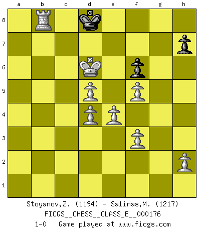 Last move : 1-0 2015 August 5 20:9:15 [Event "FICGS__CHESS__CLASS_E__000176"] [Site "FICGS"] [Date "2015.01.01"] [Round "1"] [White "Stoyanov,Zdravko"] [Black "Salinas,Marcelo"] [Result "1-0"] [WhiteElo "1194"] [BlackElo "1217"] 1.e4 e6 2.Nf3 Bd6 3.a3 Bf4 4.Nc3 e5 5.d3 Nc6 6.Nd5 g5 7.Bxf4 gxf4 8.g3 Nf6 9.gxf4 Nxd5 10.exd5 Nd4 11.Nxd4 exd4 12.Qe2+ Qe7 13.Qxe7+ Kxe7 14.O-O-O d6 15.Re1+ Kf8 16.Re4 c5 17.Bg2 Bf5 18.Re2 Re8 19.Rhe1 Rxe2 20.Rxe2 Rg8 21.Be4 Rg1+ 22.Kd2 Bxe4 23.dxe4 Rg4 24.f5 f6 25.f3 Rh4 26.Kd3 b5 27.c3 a6 28.Rf2 Rh3 29.cxd4 c4+ 30.Kc3 a5 31.a4 bxa4 32.Kxc4 Rh6 33.Kb5 Rh5 34.Kxa4 Rg5 35.Kxa5 Rg7 36.Kb6 Rd7 37.b4 Rd8 38.Kc7 Ke7 39.b5 Rd7+ 40.Kc6 Kd8 41.Ra2 Rc7+ 42.Kxd6 Rd7+ 43.Ke6 Rb7 44.Kd6 Rxb5 45.Ra8+ Rb8 46.Rxb8+ 1-0 This chess game has been lost on time (started : 2015.01.01 12:22:40) French defense Queenside Castling by player White (move 14) Player White won this chess game. Follow this game move after move (download)Becoming successful at Chess allows you to discover your own personality. That's what I want for the kids I teach. (Saudin Robovic) Kombinieren und Schwarzhandel gehören verboten. (Savielly Grigorievitsch Tartakower) La estratégia requiere pensar, la táctica requiere observación. (Max Euwe) Un millionnaire : 'Monsieur Steinitz ! Vous ne participez aux tournois que pour l'argent, alors que moi je n'y viens que pour l'honneur.' Steinitz : 'Chacun joue pour ce qu'il n'a pas'... Wipe them out. All of them. (Darth Sidious in Star Wars ep.1)