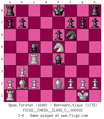 Last move : 1-0 2007 May 16 2:23:34 [Event "FICGS__CHESS__CLASS_C__000031"] [Site "FICGS"] [Date "2007.02.27"] [Round "1"] [White "Opas,Torsten"] [Black "Behrmann,Klaus"] [Result "1-0"] [WhiteElo "1648"] [BlackElo "1775"] 1.e4 c6 2.Nf3 d5 3.Nc3 dxe4 4.Nxe4 Nd7 5.Bc4 e6 6.O-O Ngf6 7.Nxf6+ Nxf6 8.d4 Qc7 9.Re1 Bd6 10.Bd3 Bd7 11.Qe2 c5 12.dxc5 Qxc5 13.b3 Qh5 14.Bb2 Bb4 15.Red1 Bc6 16.Ne5 Qxe2 17.Bxe2 Be4 18.Rd4 Bc5 19.Rc4 1-0 Caro-Kann defense Kingside Castling by player White (move 6) Player White won this chess game. Follow this game move after move (download)Modern Chess is too much concerned with things like Pawn structure. Forget it, Checkmate ends the game. (Nigel Short) Ein bischen Romantik kann weder im Schach noch in der Liebe schaden. Also versuche ich mich ab und zu daran zu erinnern. (Nigel Short) ¿Que sería del Ajedrez sin errores graciosos?. (Kurt Richter) Les Echecs représentent une sphère d'idées créatrices basée sur la volonté des deux protagonistes. (Smyslov) Any activity becomes creative when the doer cares about doing it right or doing it better. (John Updike)