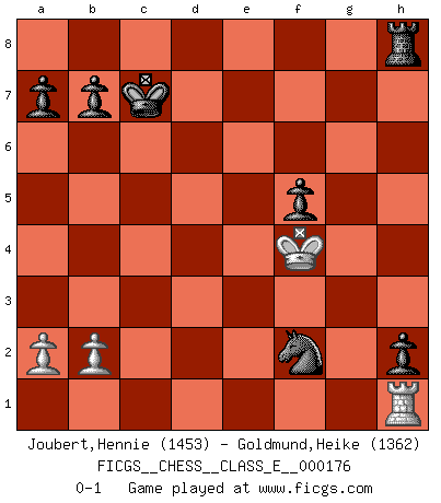 Last move : 0-1 2015 May 13 20:51:1 [Event "FICGS__CHESS__CLASS_E__000176"] [Site "FICGS"] [Date "2015.01.01"] [Round "1"] [White "Joubert,Hennie"] [Black "Goldmund,Heike"] [Result "0-1"] [WhiteElo "1453"] [BlackElo "1362"] 1.e4 d5 2.exd5 Qxd5 3.Nc3 Qa5 4.d4 Nf6 5.Nf3 Bf5 6.Bd3 Bxd3 7.Qxd3 c6 8.O-O e6 9.Bd2 Qc7 10.Bg5 Nbd7 11.Rfe1 h6 12.Bh4 g5 13.Bg3 Bd6 14.Rad1 Bxg3 15.fxg3 O-O-O 16.Qc4 Nb6 17.Qb3 Nfd5 18.Ne4 f5 19.Nc5 g4 20.Ne5 Rdg8 21.Nxe6 Qd6 22.Nf7 Qd7 23.Nxh8 Rxh8 24.Nf4 h5 25.c4 Nxf4 26.gxf4 h4 27.d5 cxd5 28.cxd5 Qd6 29.Rc1+ Kb8 30.Re6 Qxf4 31.d6 Qxc1+ 32.Kf2 Qd2+ 33.Re2 Qxd6 34.Ke1 Qxh2 35.Qe6 Qg1+ 36.Kd2 Qd4+ 37.Ke1 h3 38.gxh3 gxh3 39.Rd2 Qg1+ 40.Ke2 Qg4+ 41.Kf1 Qc4+ 42.Qxc4 Nxc4 43.Rh2 Ne3+ 44.Ke2 Ng4 45.Rh1 h2 46.Kf3 Kc7 47.Kf4 Nf2 0-1 Scandinavian defense Kingside Castling by player White (move 8) Queenside Castling by player Black (move 15) Player Black won this chess game. Follow this game move after move (download)I prefer to lose a really good game than to win a bad one. (David Levy) Karpov ist ein Museumsstück. (Garry Kasparov) El ganador de una partida es aquel jugador que hace el penúltimo error. (Savielly Tartakover) Les ravages du H expliquent la différence de niveau entre Tal et Thal [Abergel]. The only thing that matters is the evidence. (Horatio Caine, C.S.I. Miami)