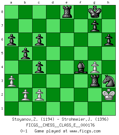 Last move : 0-1 2015 April 22 7:57:50 [Event "FICGS__CHESS__CLASS_E__000176"] [Site "FICGS"] [Date "2015.01.01"] [Round "1"] [White "Stoyanov,Zdravko"] [Black "Strohmeier,Josef"] [Result "0-1"] [WhiteElo "1194"] [BlackElo "1396"] 1.e4 e5 2.Nf3 Nc6 3.Bb5 a6 4.Bxc6 dxc6 5.h3 Bd6 6.a3 Nf6 7.d3 h6 8.O-O O-O 9.Re1 Be6 10.Nc3 Qd7 11.Kh2 Rad8 12.Be3 Qe7 13.Qd2 c5 14.Na4 b5 15.Nc3 c6 16.g4 Nh7 17.Rg1 f6 18.Rg2 c4 19.d4 exd4 20.e5 fxe5 21.Bxd4 exd4 22.Kh1 dxc3 23.Qxc3 Bd5 24.Re1 Qf7 25.Re3 Bxf3 26.Rxf3 Qxf3 27.Qxf3 Rxf3 28.Kg1 Rxh3 29.Kf1 Rh1+ 30.Ke2 Ng5 31.f3 Re8+ 32.Kf2 Rhe1 33.f4 Nh3+ 34.Kg3 R1e3+ 35.Kh2 Bxf4+ 36.Rg3 Rxg3 0-1 Ruy Lopez : Exchange variation Kingside Castling by player White (move 8) Kingside Castling by player Black (move 8) Player Black won this chess game. Follow this game move after move (download)The game of Chess is not merely an idle amusement; several very valuable qualities of the mind are to be acquired and strengthened by it, so as to become habits ready on all occasions; for life is a kind of Chess. (Benjamin Franklin) Ich habe Kasparov in Rente geschickt. (Veselin Topalov) Una de estas pequeñas movidas modestas pudieran ser mas molestas a tu oponente que la amenaza mas grande. (Siegbert Tarrasch) L'ordinateur a tué l'originalité. Il n'y a plus guère d'aventures sur l'échiquier. (Jacob Murray) Secret operations are essential in war; upon them the army relies to make its every move. (Sun Tzu)