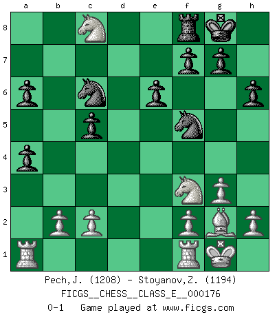 Last move : 0-1 2015 May 10 16:24:27 [Event "FICGS__CHESS__CLASS_E__000176"] [Site "FICGS"] [Date "2015.01.01"] [Round "1"] [White "Pech,Jaroslav senior"] [Black "Stoyanov,Zdravko"] [Result "0-1"] [WhiteElo "1208"] [BlackElo "1194"] 1.Nf3 c5 2.g3 a6 3.Bg2 Nc6 4.d4 e6 5.O-O h6 6.e4 d6 7.dxc5 dxc5 8.Qxd8+ Nxd8 9.Bf4 Nf6 10.Nbd2 b5 11.a4 bxa4 12.Nc4 Nxe4 13.Nb6 Bd6 14.Bxd6 Nxd6 15.Nxa8 O-O 16.Nb6 Nf5 17.Nxc8 Nc6 0-1 This chess game has been lost on time (started : 2015.01.01 12:22:40) Reti Opening Kingside Castling by player White (move 5) Kingside Castling by player Black (move 15) Player Black won this chess game. Follow this game move after move (download)It is not enough to be a good player... you must also play well. (Siegbert Tarrasch) Der Umstand, daß uns eine 7 Stunden Zeitkontrolle ermöglicht eine großartige, tiefe Partie zu spielen, ist für die Massenmedien nicht weiter von Bedeutung. (Alexej Shirov) Después de la respuesta de las negras a 1.e4 con 1..e5, se quedan siempre tratando de entrar dentro del juego. (Howard Staunton) Le temps de noter son nom sur la feuille de partie, j'étais déjà en zeitnot ! D'un modeste amateur apparié lors de la première ronde d'un open contre le grand-maître Azmaïparashvili. Mandala - that's it! 16x16 squares as multiple of the four and the eight because of the Four Noble Truths and the Noble Eightfold Path. (Heinz-Georg Lehnhoff about Big Chess)