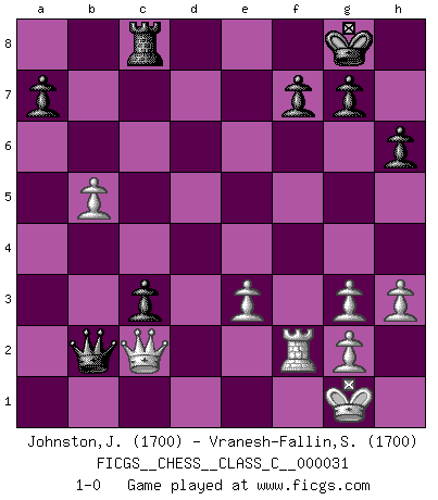 Last move : 1-0 2007 May 25 11:3:19 [Event "FICGS__CHESS__CLASS_C__000031"] [Site "FICGS"] [Date "2007.02.27"] [Round "1"] [White "Johnston,Jim"] [Black "Vranesh-Fallin,Scott"] [Result "1-0"] [WhiteElo "1700"] [BlackElo "1700"] 1.d4 d5 2.c4 e6 3.Nc3 Nf6 4.cxd5 exd5 5.Bg5 Bb4 6.Nf3 O-O 7.Qc2 Nc6 8.e3 h6 9.Bh4 Qd6 10.Bd3 Bxc3+ 11.bxc3 Bg4 12.Nd2 Rae8 13.O-O b6 14.Bg3 Qd8 15.a3 Na5 16.c4 dxc4 17.Nxc4 Nxc4 18.Qxc4 c5 19.dxc5 bxc5 20.h3 Be6 21.Qc2 Qe7 22.Rfd1 Rd8 23.Be2 Rfe8 24.Rac1 Rxd1+ 25.Rxd1 Bd5 26.a4 Bc6 27.Bb5 Bxb5 28.axb5 Ne4 29.Bh2 Rc8 30.Rd5 c4 31.Re5 Qb4 32.Bg3 Nxg3 33.fxg3 c3 34.Rf5 Qb2 35.Rf2 1-0 QGD : Exchange, positional line Kingside Castling by player Black (move 6) Kingside Castling by player White (move 13) Player White won this chess game. Follow this game move after move (download)Personally, I rather look forward to a computer program winning the world Chess Championship. Humanity needs a lesson in humility. (Richard Dawkings) Wenn Du nicht kämpfst, um anderen etwas zu beweisen, sondern nur für Dich selbst, dann bist du fast unbesiegbar. (Garry Kasparov) El Peón aislado arroja penumbra sobre todo el tablero. (Aaron Nimzovich) Lorsque vous vous retrouvez devant une position atroce, ne tendez pas un ultime piège dérisoire avec l'intention d'abandonner si l'adversaire le déjoue ! Faites-vous plutôt un devoir de résister comme si votre vie en dépendait. Jouez le coup qui vous déplairait au centuple si vous étiez dans la peau de votre tortionnaire ! Remember : Your focus determines your reality. (Qui-Gon Jinn in Star Wars ep.1)