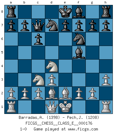 Last move : 1-0 2015 March 19 21:8:17 [Event "FICGS__CHESS__CLASS_E__000176"] [Site "FICGS"] [Date "2015.01.01"] [Round "1"] [White "Barradas,Anderson"] [Black "Pech,Jaroslav senior"] [Result "1-0"] [WhiteElo "1398"] [BlackElo "1208"] 1.e4 d5 2.exd5 Qxd5 3.Nf3 Nf6 4.Nc3 Qa5 5.h3 Bf5 6.d3 c6 7.Bd2 Nbd7 8.Be2 Qc7 9.Nd4 1-0 This chess game has been lost on time (started : 2015.01.01 12:22:40) Scandinavian (centre counter) defense Player White won this chess game. Follow this game move after move (download)By this measure (on the gap between Fischer & his contemporaries), I consider him the greatest world champion. (Garry Kasparov) Wir können eben der zündenden Macht des Opfers nicht wiederstehen, denn die Begeisterung für das Opfer liegt in der Natur des Menschen. (Rudolf Spielmann) El Ajedrez es un juego terrible. Si no dominas el centro, tu oponente tiene una posición mas libre. Si tu tienes el centro, entonces realmente tienes algo de que preocuparte. (Siegbert Tarrasch) À la honte des hommes, on sait que les lois du jeu sont les seules qui soient partout justes, claires, inviolables et exécutées. Pourquoi l'Indien qui a donné les règles du jeu d'échecs est-il obéi de bon gré dans toute la terre, et que les décrétales des papes, par exemple, sont aujourd'hui un objet d'horreur et de mépris ? C'est que l'inventeur des échecs combina tout avec justesse pour la satisfaction des joueurs, et que les papes, dans leurs décrétales, n'eurent en vue que leur seul avantage. L'Indien voulut exercer également l'esprit des hommes et leur donner du plaisir; les papes ont voulu abrutir l'esprit des hommes. Voltaire (Dictionnaire philosophique / Garnier 1967) Animated gif is worth one mega-word. (Unknown)