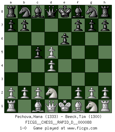 Last move : 1-0 2015 February 21 22:11:56 [Event "FICGS__CHESS__RAPID_D__000088"] [Site "FICGS"] [Date "2015.01.01"] [Round "1"] [White "Pechova,Hana"] [Black "Beeck,Tim"] [Result "1-0"] [WhiteElo "1333"] [BlackElo "1300"] 1.e4 e6 2.d4 d5 3.Nd2 c5 4.exd5 1-0 French : Tarrasch, Open variation Player White won this chess game. Follow this game move after move (download)I have added these principles to the law: get the Knights into action before both Bishops are developed. (Emanuel Lasker) Die Leute spielen gegen mich seit 15 Jahren unter Ihren Möglichkeiten. (Robert James Fischer) Fischer es el jugador mas fuerte del mundo. De hecho, el jugador mas fuerte que jamas haya existido. (Larry Evans) Echiquier : carré parfait, comme la Jérusalem nouvelle décrite par l'auteur de l'Apocalypse, huit cases sur huit, exaltation du chiffre 4, symbole du cosmos aux quatre horizons... où le noir et le blanc, l'ombre et la lumière, le mal et le bien s'entremêlent et se conjuguent. (Robert Couffignal, Le Gambit du poète) The best teachers teach from the heart, not from the book. (Author unknown)