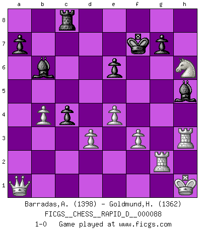 Last move : 1-0 2015 April 1 22:49:12 [Event "FICGS__CHESS__RAPID_D__000088"] [Site "FICGS"] [Date "2015.01.01"] [Round "1"] [White "Barradas,Anderson"] [Black "Goldmund,Heike"] [Result "1-0"] [WhiteElo "1398"] [BlackElo "1362"] 1.e4 e5 2.Nf3 Nc6 3.Bb5 Bc5 4.O-O Nf6 5.d3 O-O 6.Bg5 d6 7.Nc3 Bg4 8.h3 Bh5 9.g4 Bg6 10.h4 h6 11.Bxf6 Qxf6 12.Nd5 Qe6 13.Nh2 Nd4 14.Nxc7 Qf6 15.Nxa8 Rxa8 16.Bc4 Qxh4 17.c3 Ne6 18.b4 Bb6 19.Bxe6 fxe6 20.a4 h5 21.a5 Bc7 22.f3 Qg3+ 23.Kh1 h4 24.Ra2 b6 25.Rg1 Qf4 26.g5 Bd8 27.Rg4 Qf7 28.Qe2 Rc8 29.Qe1 d5 30.axb6 Bxb6 31.Rxh4 Bd8 32.Rg4 Bh5 33.Rg3 Qf4 34.Rh3 Qxg5 35.Rg2 Qh6 36.Ng4 Qg6 37.Nxe5 Qh6 38.Qa1 Bb6 39.c4 dxc4 40.Ng4 Kf7 41.Nxh6+ 1-0 Ruy Lopez : Classical (Cordel) defense Kingside Castling by player White (move 4) Kingside Castling by player Black (move 5) Player White won this chess game. Follow this game move after move (download)We must make sure that Chess will not be like a dead language, very interesting, but for a very small group. (Sytze Faber) Kein Großmeister ist normal. Sie unterscheiden sich nur im Ausmaß Ihrer Verrücktheit. (Viktor Kortschnoi) No volvere nunca a jugar contigo. Has insultado a mi amigo. - cuando un oponente se maldijo por una mala jugada (Miguel Najdorf) Demandez au pauvre Cg1 ce qu'il en pense. Eduard Gufeld à propos de la variante Saemisch de l'Est-Indienne. Life is like a game of cards: the hand you are dealt represents determinism; the way you play it is free will. (Jawaharlal Nehru)