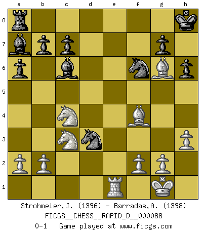 Last move : 0-1 2015 March 6 16:55:24 [Event "FICGS__CHESS__RAPID_D__000088"] [Site "FICGS"] [Date "2015.01.01"] [Round "1"] [White "Strohmeier,Josef"] [Black "Barradas,Anderson"] [Result "0-1"] [WhiteElo "1396"] [BlackElo "1398"] 1.e4 e5 2.Bc4 Nf6 3.d3 Bc5 4.Nf3 d6 5.h3 O-O 6.O-O h6 7.c3 a6 8.d4 exd4 9.cxd4 Bb6 10.Nc3 Nbd7 11.Re1 Re8 12.e5 dxe5 13.dxe5 Nh7 14.e6 fxe6 15.Bxe6+ Kh8 16.Bb3 Nc5 17.Bc2 Nf6 18.Be3 Bd7 19.Qd2 Bc6 20.Rad1 Qxd2 21.Nxd2 Ba7 22.Bg6 Re5 23.Nc4 Re7 24.Bf4 Rxe1+ 25.Rxe1 Nd3 0-1 Bishop's Opening : Berlin defense Kingside Castling by player Black (move 5) Kingside Castling by player White (move 6) Player Black won this chess game. Follow this game move after move (download)When you see a good move, look for a better one. (Emanuel Lasker) Du musst Deinen Gegner in einen tiefen dunklen Wald führen wo 2+2=5 ist und wo der Weg, der wieder hinausführt, nur breit genug für einen ist. (Mikhail Nekhemyevich Tal) El Ajedrez se juega con la mente... ¡no con las manos!. (Renaud y Kahn) La vie et les Echecs sont tous les deux une lutte constante. (Lasker) The Internet is the world's largest library. It's just that all the books are on the floor. (John Allen Paulos)